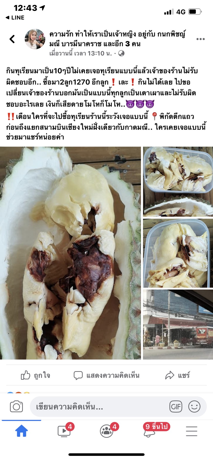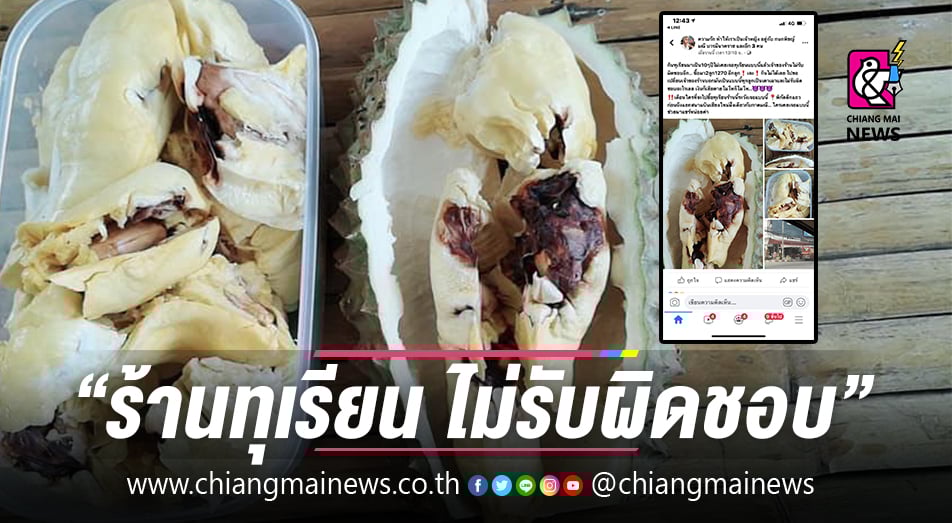 จากเฟซบุ๊กที่ใช้ชื่อว่า “ความรัก ทำให้เราเป็นเจ้าหญิง” ได้นำภาพทุเรียนที่ได้ซื้อมาแถวย่านสี่แยกแอร์พอต อ.เมืองเชียงใหม่ 2 ลูก ราคา 1,270 บาท ทั้งเละ และยังเป็นเตาเผา ไม่สวย ไปขอเปลี่ยนกลับถูกปฏิเสธจากทางร้าน โดยสาวดังกล่าวได้เขียนโพสต์ลงในเฟซบุ๊ก ระบุ “กินทุเรียนมาเป็น10ๆปีไม่เคยเจอทุเรียนแบบนี้แล้วเจ้าของร้านไม่รับผิดชอบอีก.. ซื้อมา2ลูก1270 อีกลูกเละ กินไม่ได้เลย ไปขอเปลี่ยนเจ้าของร้านบอกมันเป็นแบบนี้ทุกลูกเป็นเตาเผาและไม่รับผิดชอบอะไรเลย เงินก็เสียดายโมโหก็โมโห.,,,‼️เตือนใครที่จะไปซื้อทุเรียนร้านนี้ระวังเจอแบบนี้ พิกัดตึกแถวก่อนถึงแยกสนามบินเชียงใหม่ฝั่งเดียวกับกาดมณี.. ใครเคยเจอแบบนี้ช่วยมาแชร์หน่อยค่า”