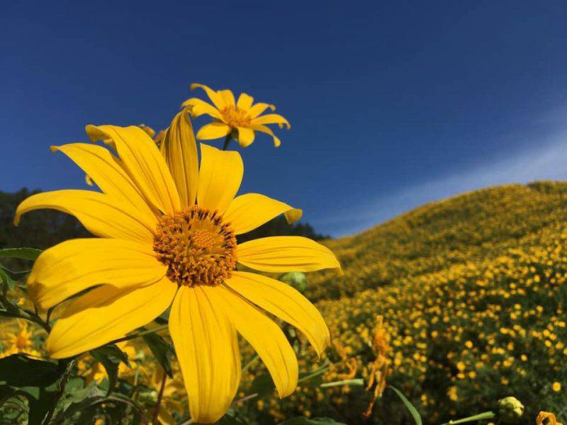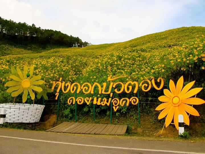 ทุ่งดอกบัวตอง อ.ขุนยวม จ.แม่ฮ่องสอน จะบานสะพรั่งในช่วงเดือนพฤศจิกายน ถึงต้นเดือนธันวาคม ของทุกปี สีเหลืองส้มของดอกบัวตองจะปกคลุมเต็มเทือกเขา ตั้งแต่ดอยแม่อูคอ ในเขต บ้านสุรินทร์ ไปจนถึงเกือบสุดปลายทางถนน 108 ถือเป็นทุ่งดอกบัวตองที่ใหญ่ที่สุดในประเทศไทย ซึ่งมีให้ชมเพียงปีละครั้งเท่านั้น โดยปี 2563 จะมีการเปิดให้เข้าชมตั้งแต่วันที่ 6 พฤศจิกายน เป็นต้นไป