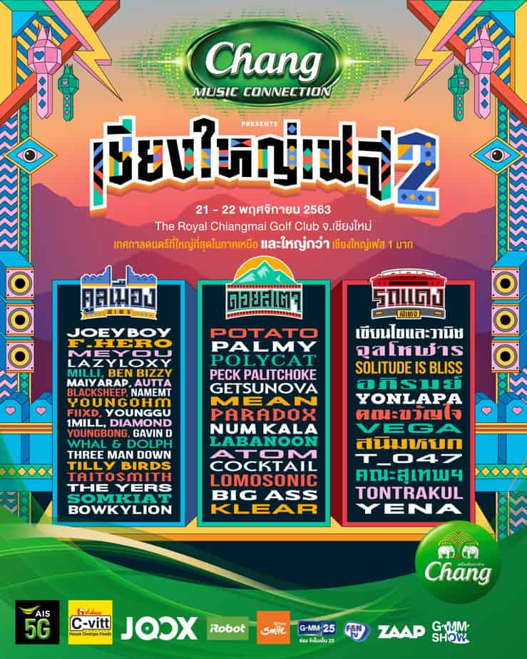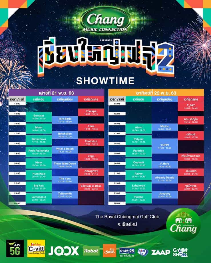 “เชียงใหญ่เฟส 2” มาพร้อมกับไลน์อัพศิลปินเบอร์ใหญ่ของประเทศกว่า 50 ศิลปิน นำโดย POTATO, PALMY, POLYCAT, PECK PALITCHOKE, GETSUNOVA, JOEYBOY, F.HERO, THREE MAN DOWN, MEAN, PARADOX, NUM KALA, LABANOON, ATOM, MEYOU, COCKTAIL, LOMOSONIC, TAITOSMITH, BIG ASS, KLEAR, TILLYBIRDS, LAZYLOXY, MILLI, BEN BIZZY, MAIYARAP, BLACKSHEEP, NAMEMT, AUTTA, YOUNGOHM, FIIXED, YOUNGGU, DAIMOND, YOUNGBONG, GAVIN D, 1 MILL, เขียนไขและวานิช, จุลโหฬาร, BOWKYLION, THE YERS, WHAL & DOLPH, SOMKIAT, YENA, คณะสุเทพฯ, SOLITUDE IS BLISS, YONLAPA, TONTRAKUL, อภิรมย์, คณะขวัญใจ, สนิมหยก, T_047 และ VEGA พูดเลยว่าในภาคเหนือไม่เคยมีงานไหนที่มีศิลปินรวมตัวได้เยอะขนาดนี้มาก่อน ชนิดที่ครบทุกแนวดนตรีทั้ง POP, ROCK, HIPHOP, INDY, FOLK ที่ขนเอาเพลงสุดฮิตมาร้อง มาเต้น มาสนุกบน 3 เวทีใหญ่ ไม่ว่าจะเป็น