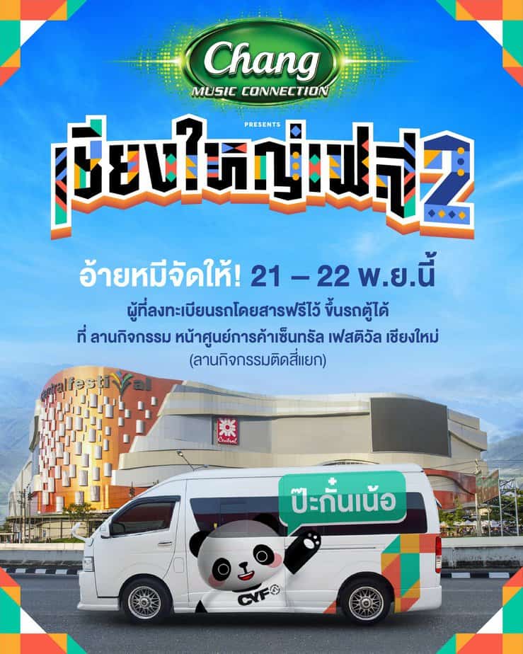 รู้แบบนี้แล้วเตรียมไปใช้สีสันใหม่ๆให้กับชีวิต สนุกปลายปีนี้ที่งาน Chang Music Connection Presents “เชียงใหญ่เฟส2” เทศกาลดนตรีที่ใหญ่ที่สุดของภาคเหนือ ?? สำหรับคนที่ลงทะเบียนรถรับ – ส่ง ฟรี ไว้แล้วที่ https://chiangyaifest.com/transedit สามารถขึ้นรถตู้ที่ทางคอนเสิร์ตจัดให้ ณ ลานกิจกรรม หน้าศูนย์การค้าเซ็นทรัล เฟสติวัล เชียงใหม่ (ลานกิจกรรมติดสี่แยก)