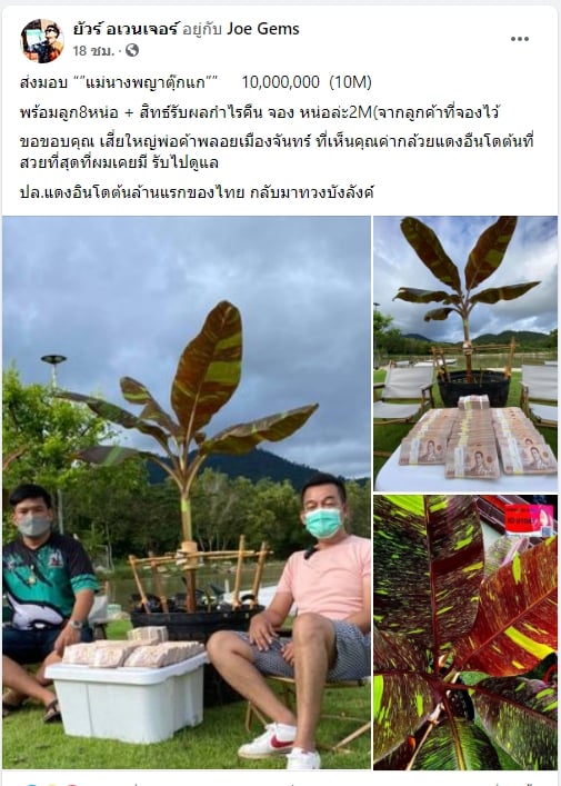 ล่าสุดวานนี้ (22 ก.ย. 64) ในกลุ่มเฟซบุ๊ก กล้วยแดงอินโด กล้วยด่าง ที่มีสมาชิกกว่าแสนคน เกิดกระแสฮือฮาหลังมีการโพสต์ซื้อขายกล้วยด่างในราคา 10 ล้านบาท โดยระบุว่า