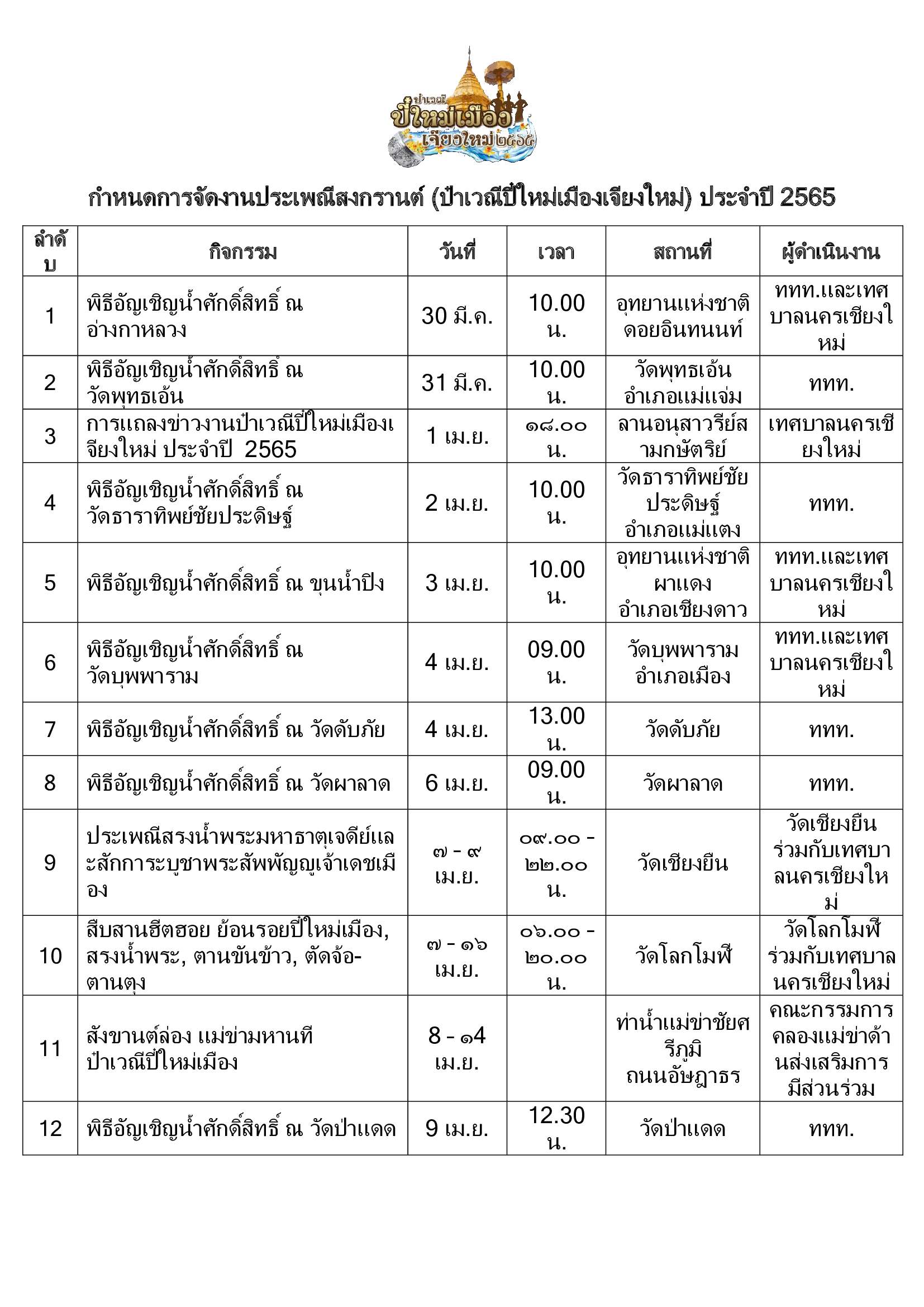 วันที่ 1 เมษายน 2565 – นายศักดิ์ชัย คุณานุวัฒน์ชัยเดช รองผู้ว่าราชการจังหวัดเชียงใหม่ เป็นประธานในการแถลงข่าวการจัดงานประเพณีสงกรานต์ (ป๋าเวณีปี๋ใหม่เมืองเจียงใหม่) ประจำปี 2565 โดยมี นายอัศนี