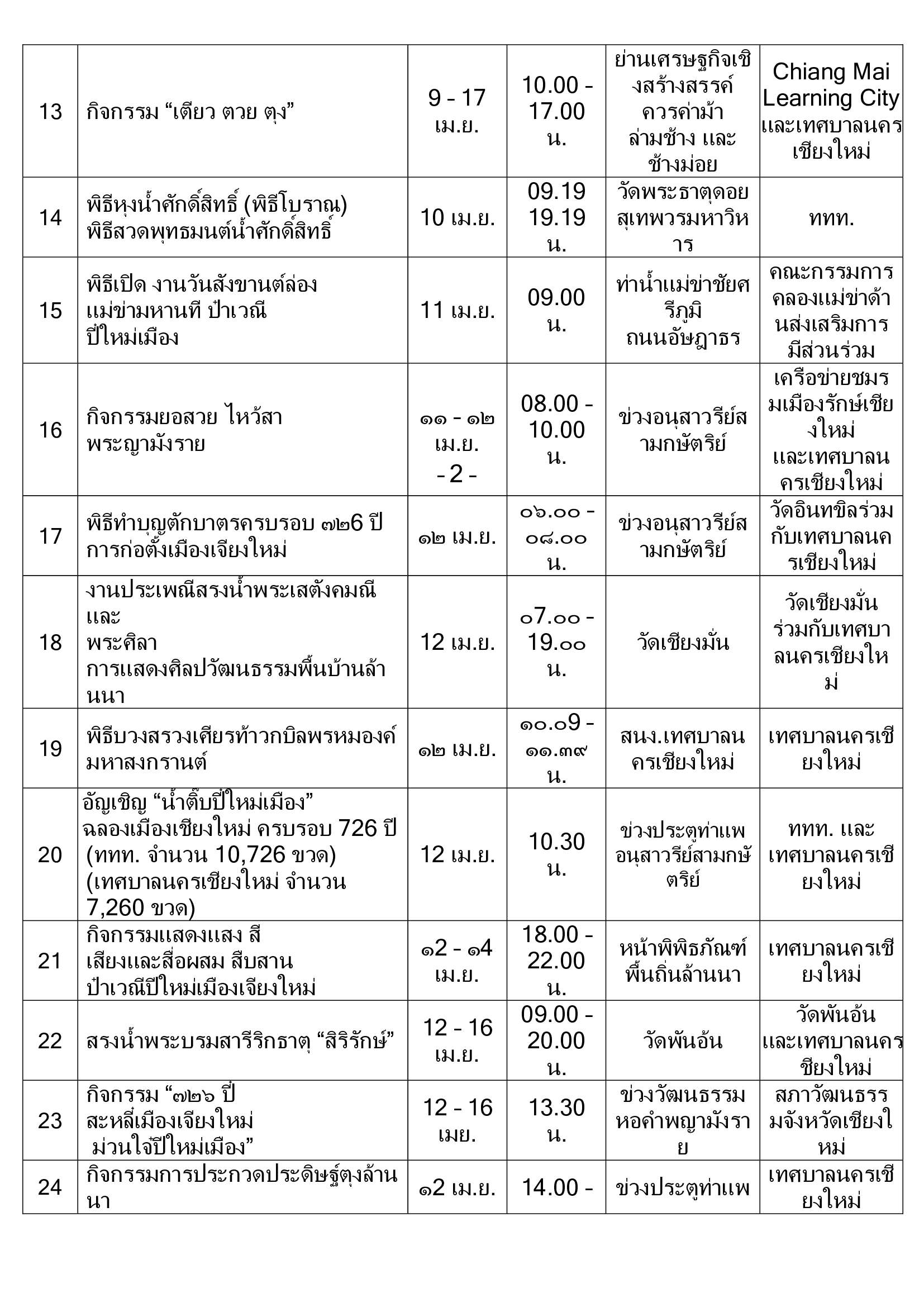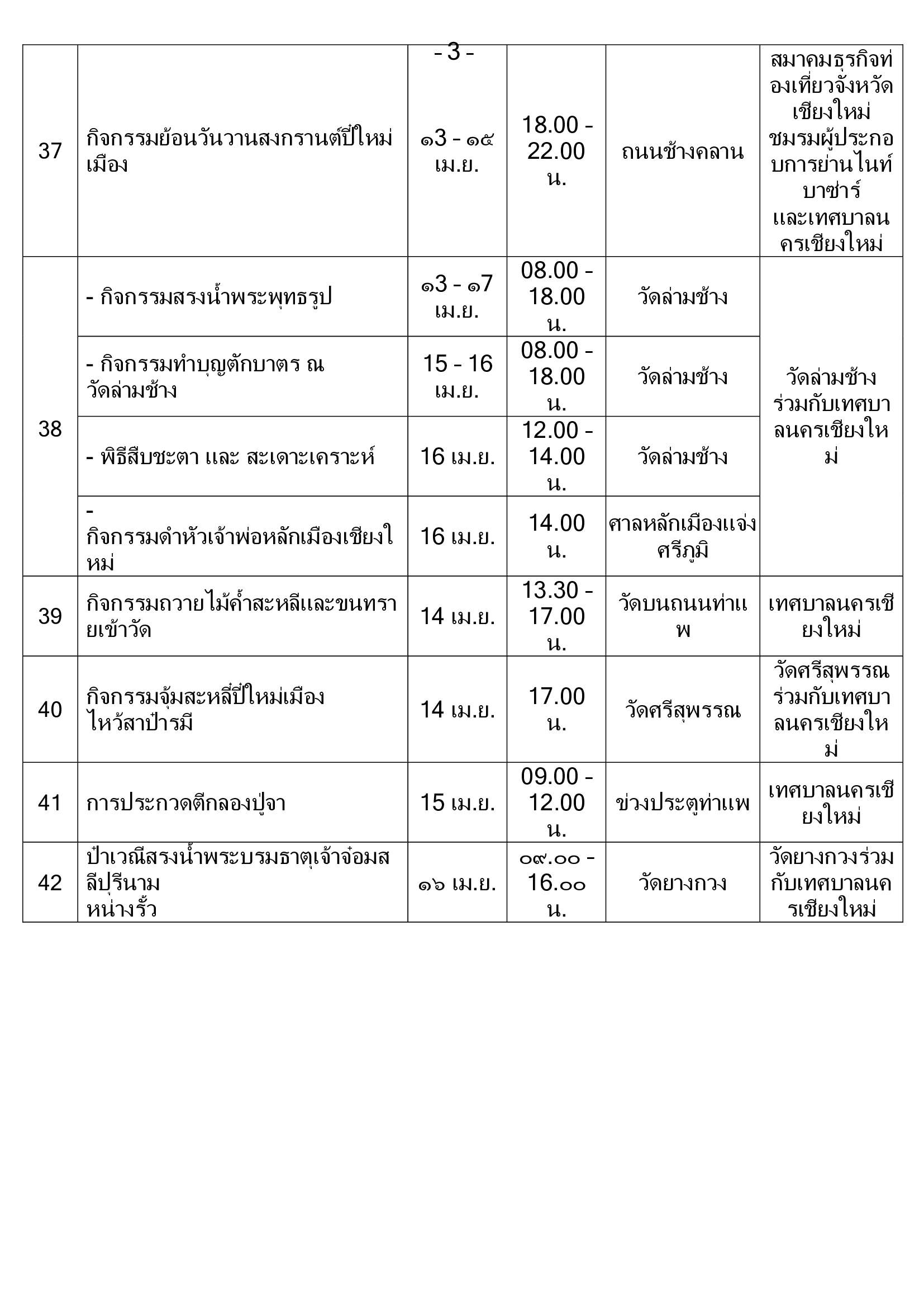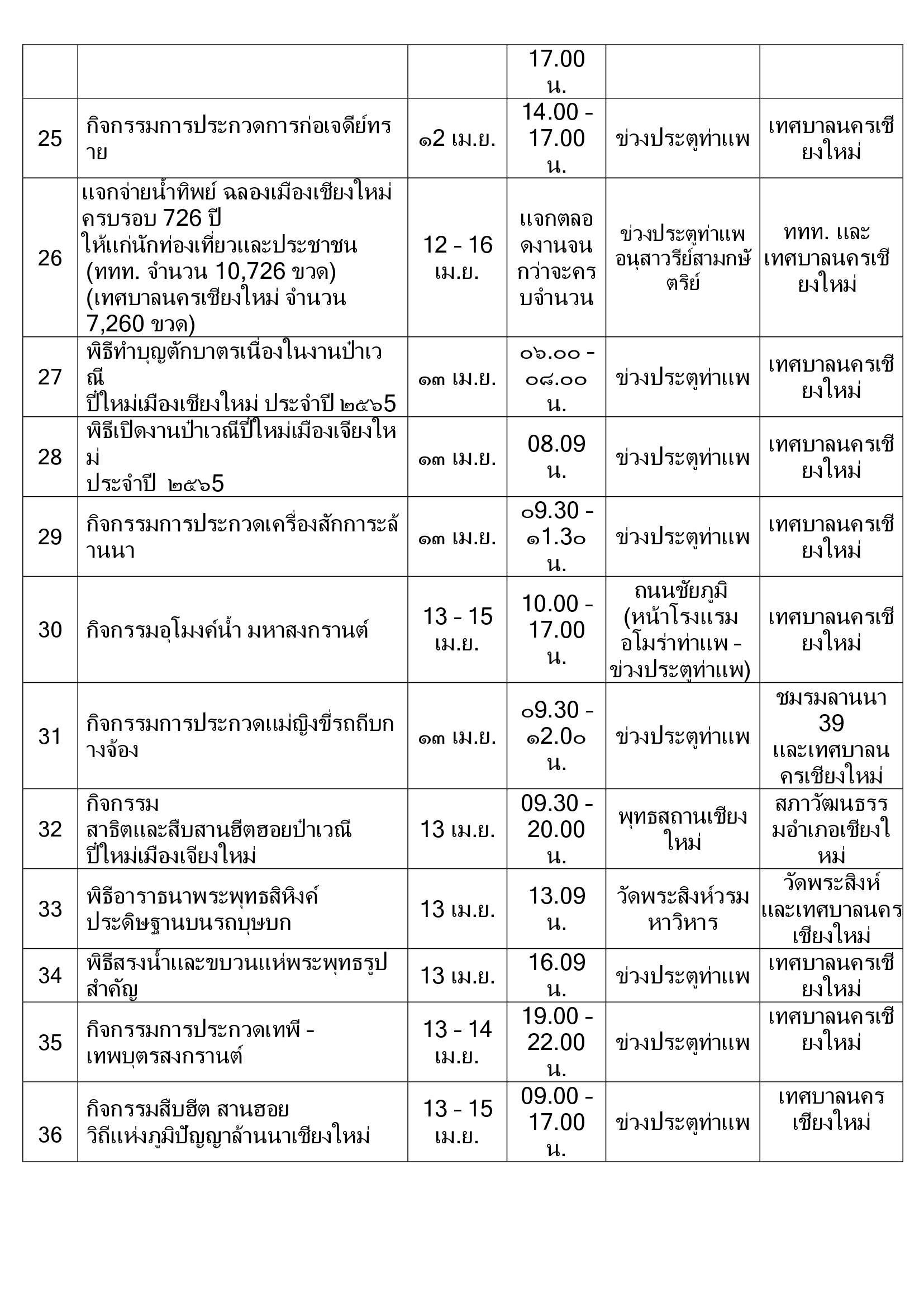 ทั้งนี้ เพื่อให้เป็นไปตามประกาศของคณะกรรมการโรคติดต่อจังหวัดเชียงใหม่ เทศบาลนครเชียงใหม่จึงขอความร่วมมือจากประชาชนและนักท่องเที่ยวงดเล่นสาดน้ำ ประแป้ง ตลอดห้วงระยะเวลาของการจัดงานประเพณีสงกรานต์ ปฏิบัติตามมาตรการสาธารณสุขอย่างเคร่งครัดในการเข้าร่วมกิจกรรมต่างๆ เช่น