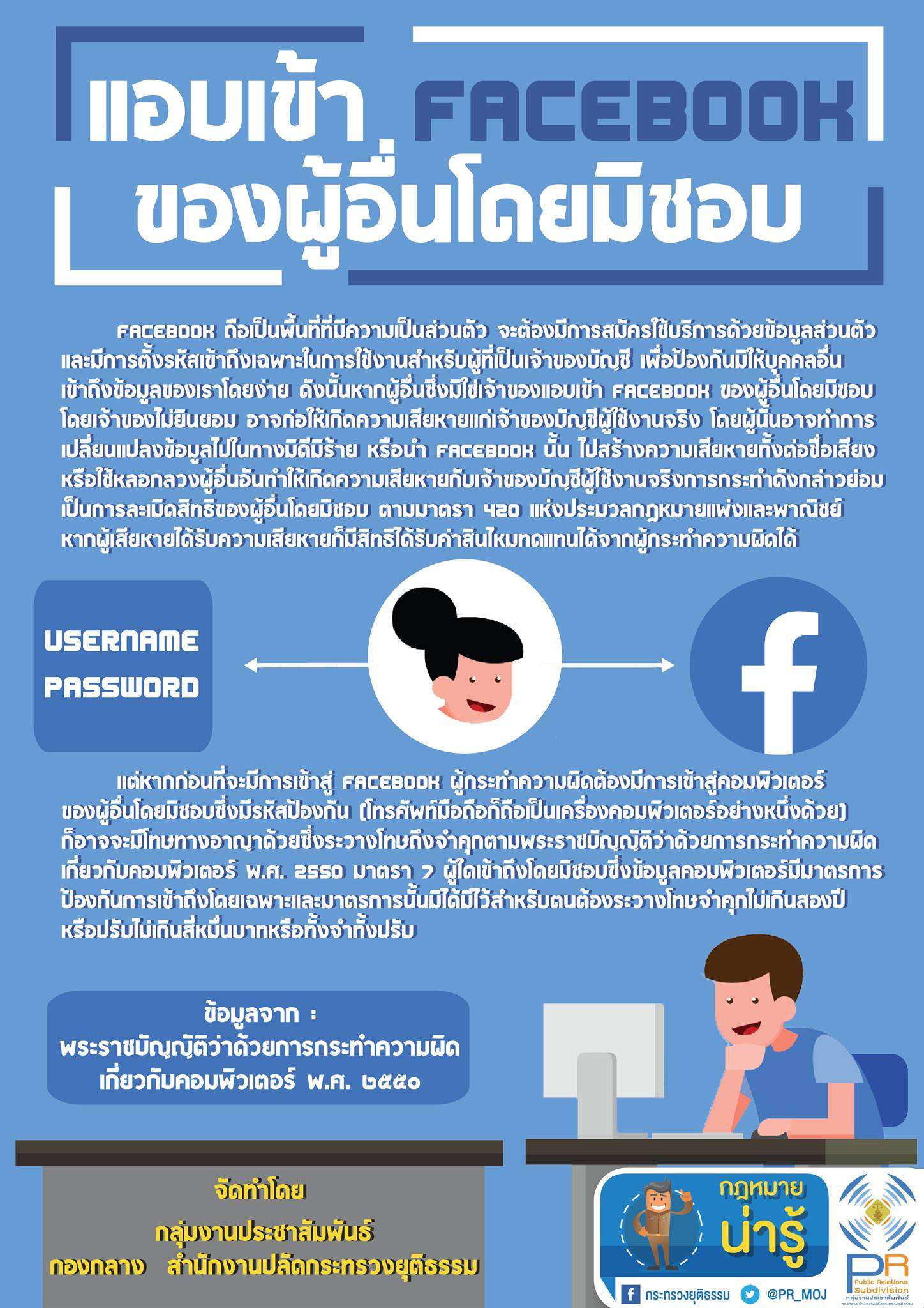 กระทรวงยุติธรรม เสนอกฎหมายน่ารู้ เกี่ยวกับเรื่องของการ แอบเข้าเฟซบุ๊คของผู้อื่นโดยมิชอบ มีความผิด โดยเฟซบุ๊ค Facebook ถือเป็นพื้นที่ที่มีความเป็นส่วนตัว จะต้องมีการสมัครใช้บริการด้วยข้อมูลส่วนตัวและมีการตั้งรหัสเข้าถึงเฉพาะในการใช้งานสำหรับผู้ที่เป็นเจ้าของบัญชี เพื่อป้องกันมิให้บุคคลอื่นเข้าถึงข้อมูลของเราโดยง่าย