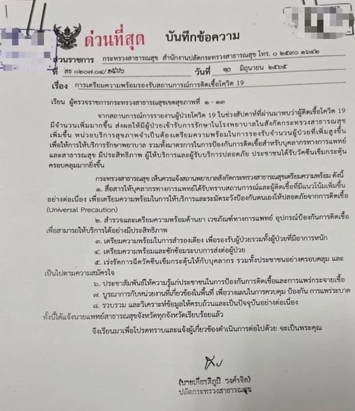 เมื่อวันที่ 5 ก.ค. ผู้สื่อข่าวรายงานว่า เพจ “ชมรมแพทย์ชนบท” โพสต์ภาพหนังสือราชการ “ด่วนที่สุด” ของ กระทรวงสาธารณสุข พร้อมข้อความระบุว่า ส่งสัญญานเตือน เตรียมพร้อมรับโควิด19ระลอกใหม่