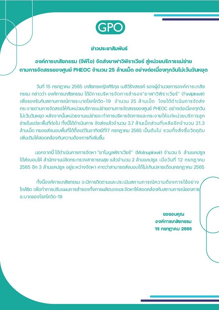 วันที่ 15 กรกฎาคม 2565 เภสัชกรหญิงศิริกุล เมธีวีรังสรรค์ รองผู้อำนวยการองค์การเภสัชกรรม กล่าวว่า องค์การเภสัชกรรม ได้มีการบริหารจัดการสำรอง “ยาฟาวิพิราเวียร์” (Favipiravir) เพื่อรองรับกับสถานการณ์การระบาดโรคโควิด-19 จำนวน 25 ล้านเม็ด โดยได้ดำเนินการจัดส่งกระจายตามการจัดสรรให้กับหน่วยบริการแม่ข่ายตามการจัดสรรของศูนย์ PHEOC อย่างต่อเนื่องทุกวันไม่เว้นวันหยุด หลังจากนั้นหน่วยงานแม่ข่ายจะทำการบริหารจัดการและกระจายให้แก่หน่วยบริการลูกข่ายในแต่ละพื้นที่ต่อไป ทั้งนี้ได้ดำเนินการ จัดส่งแล้วจำนวน 3.7 ล้านเม็ด ส่วนที่เหลืออีกจำนวน 21.3 ล้านเม็ด ทยอยส่งมอบพื้นที่ได้ตั้งแต่วันอาทิตย์ที่ 17 กรกฎาคม 2565 เป็นต้นไป รวมทั้งสั่งซื้อวัตถุดิบเพิ่มเติมให้สอดคล้องกับความต้องการที่เพิ่มขึ้น