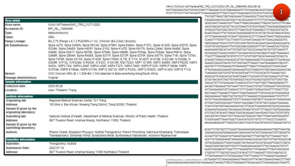 จากการเก็บตัวอย่างโดยศูนย์วิทยาศาสตร์การแพทย์ที่ 12/1 ตรัง เมื่อวันที่ 28 มิถุนายน 2565 โดยกรมวิทยาศาสตร์การแพทย์ กระทรวงสาธารณสุข ถอดรหัสพันธุกรรมทั้งจีโนมและ upload ขึ้นบนฐานข้อมูลโควิดโลก “GISAID” เป็นที่เรียบร้อย เมื่อวันที่ 18 กรกฎาคม 2565