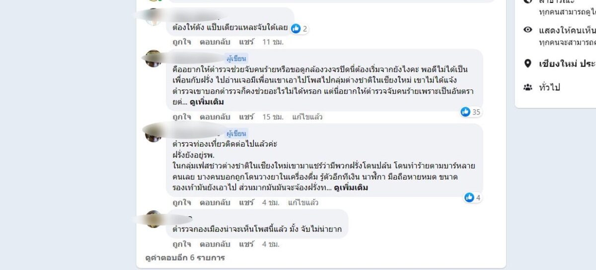 ขณะที่มีบางคนโพสต์ถึงความคืบหน้าว่า “ตำรวจท่องเที่ยวติดต่อไปแล้วค่ะฝรั่งยังอยู่รพ.ในกลุ่มเฟสชาวต่างชาติในเชียงใหม่เขามาแชร์ว่ามีพวกฝรั่งโดนปล้น โดนทำร้ายตามบาร์หลายคนเลย บางคนบอกถูกโดนวางยาในเครื่องดื่ม รู้ตัวอีกทีเงิน นาฬิกา มือถือหายหมด ขนาดรองเท้ามันยังเอาไป ส่วนมากมันมันจะจ้องฝรั่งที่มาเที่ยวคนเดียว และก็ไม่ค่อยเป็นข่าวเพราะฝรั่งมาคนเดียวเขาก็ไม่ค่อยกล้าจะไปเอาเรื่อง”