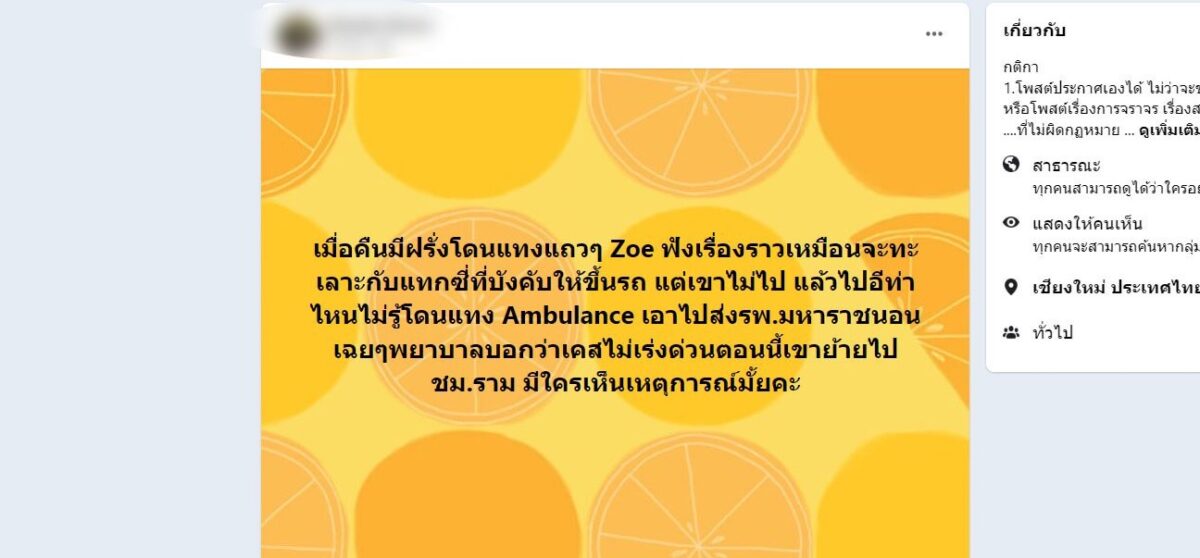 เมื่อวันที่ 28 ก.ค.2565 มีพลเมืองดีในจังหวัดเชียงใหม่โพส์ตแชร์เรื่องราวของนักท่องเที่ยวชาวต่างชาติ เป็นชาย รายหนึ่ง ถูกทำร้ายร่างกายด้วยอาวุธมีด แทงเข้าที่ร่างกาย ได้รับบาดเจ็บ จนต้องนำตัวส่งโรงพยาบาล เหตุเกิดจากหลังจากที่ออกจากผับดังใจกลางเมืองเชียงใหม่ ก่อนที่จะถูกนักท่องเที่ยวระบะว่าเป็นแท็กซี่ ที่เข้ามาเรียกให้ใช้บริการรถรับส่ง แต่เกิดปากเสียงกันจนถูกทำร้ายดังกล่าว โดยโพสต์ข้อความเล่าว่า “เมื่อคืนมีฝรั่งโดนแทงแถวๆ Zoe ฟังเรื่องราวเหมือนจะทะเลาะกับแทกซี่ที่บังคับให้ขึ้นรถ แต่เขาไม่ไป แล้วไปอีท่าไหนไม่รู้โดนแทง Ambulance เอาไปส่งรพ.มหาราชนอนเฉยๆพยาบาลบอกว่าเคสไม่เร่งด่วนตอนนี้เขาย้ายไปชม.ราม มีใครเห็นเหตุการณ์มั้ยคะ”