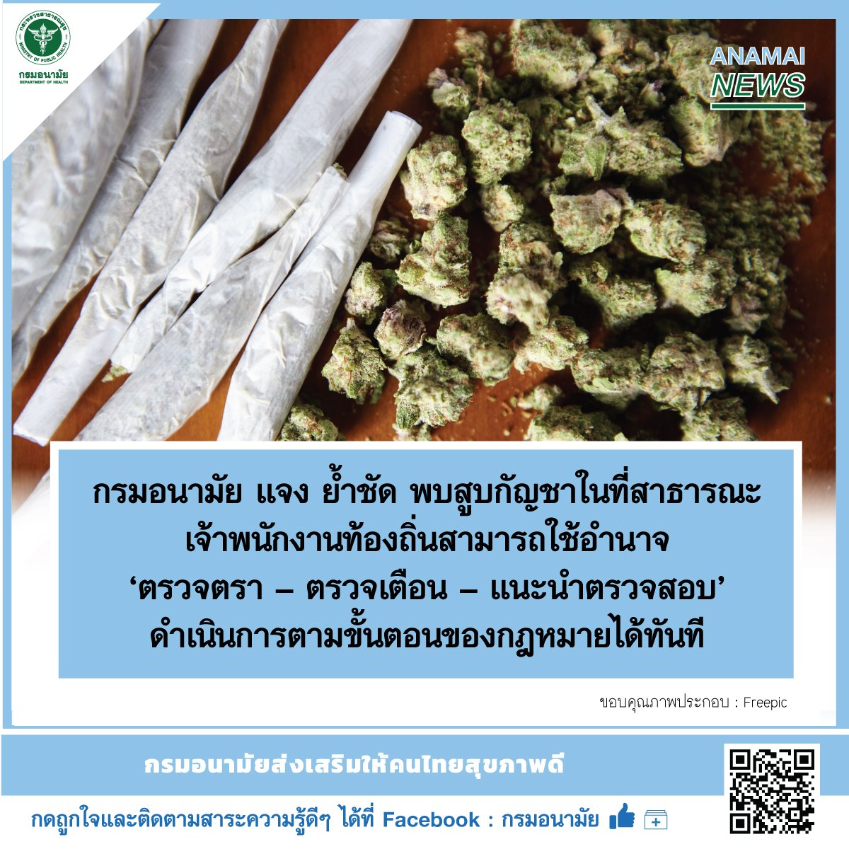 กรมอนามัย แจง ย้ำชัด พบสูบกัญชาในที่สาธารณะ เจ้าพนักงานท้องถิ่นสามารถใช้อำนาจ ‘ตรวจตรา – ตรวจเตือน – แนะนำตรวจสอบ’ ดำเนินการตามขั้นตอนของกฎหมายได้ทันที