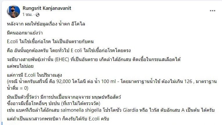 ล่าสุดทางด้าน นายแพทย์รังสฤษฎ์ กาญจนะวณิชย์ อายุรแพทย์โรคหัวใจ คณะแพทยศาสตร์ มหาวิทยาลัยเชียงใหม่ โพสต์เฟซ บุ๊ก Rungsrit Kanjanavanit อีกครั้ง โดยโพสต์ว่า “หลังจาก ผมให้ข้อมูลเรื่อง น้ำตก อีโคไล มีคนออกมาแย้งว่า E.coli ไม่ใช่เชื้อก่อโรค ไม่เป็นอันตรายกับคน คือ อันนั้นถูกต้องครับ โดยทั่วไป E coli ไม่ใช่เชื้อก่อโรคโดยตรง จะมีบางสายพันธุ์เท่านั้น (EHEC) ที่เป็นอันตราย เกิดลำไส้อักเสบ ติดเชื้อในกระแสเลือดได้ แต่พบไม่บ่อย แต่การมี E.coli ในปริมาณสูง (กรณี น้ำตกรับเสร็จนี้ คือ 92,000 โคโลนี ต่อ น้ำ 100 ml – โดยมาตราฐานน้ำใช้ ต้องไม่เกิน 126 , มาตราฐานน้ำดื่ม = 0) มันเป็นตัวชี้วัดว่า มีการปนเปื้อนจากอุจจาระ มนุษย์หรือสัตว์ ซึ่งอาจมีเชื้อโรคอื่นๆ ปะปน (ที่เราไม่ได้ตรวจวัด)เช่น แบคทีเรียลำไส้อักเสบ salmonella shigella โปรโตซัว Giardia หรือ ไวรัส ตับอักเสบ A เป็นต้น ได้ครับ แต่ถ้าเป็นแนวสาวกพระบิดา ก็คงรับได้กับ E.coli ครับ “