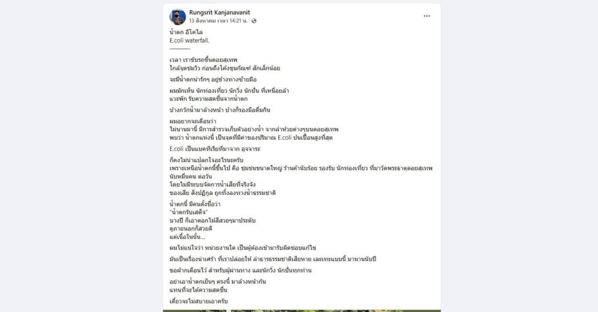 จากกรณีที่นายแพทย์รังสฤษฎ์ กาญจนะวณิชย์ อายุรแพทย์โรคหัวใจ คณะแพทยศาสตร์ มหาวิทยาลัยเชียงใหม่ โพสต์เฟซ บุ๊ก Rungsrit Kanjanavanit เรื่องพบการปนเปื้อนของเชื้อแบคทีเรีย “อีโคไล” ในน้ำตกแห่งหนึ่ง ทางขึ้นอุทยานแห่งชาติดอยสุเทพ-ปุย จังหวัดเชียงใหม่ ตำบลสุเทพ อำเภอเมือง จังหวัดเชียงใหม่ บริเวณโค้งขุนกัณฑ์ก่อนถึงวัดพระธาตุดอยสุเทพราชวรวิหาร ซึ่งมีคนตั้งชื่อว่า “น้ำตกรับเสด็จ” นั้น