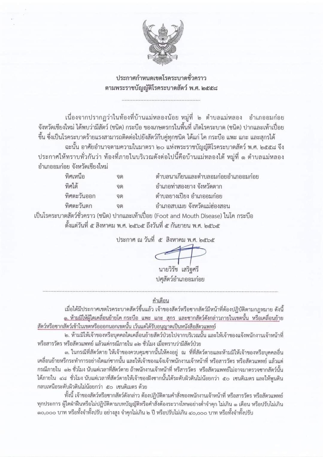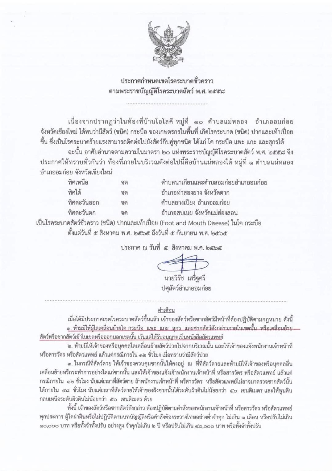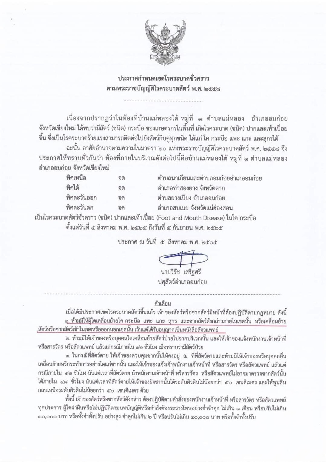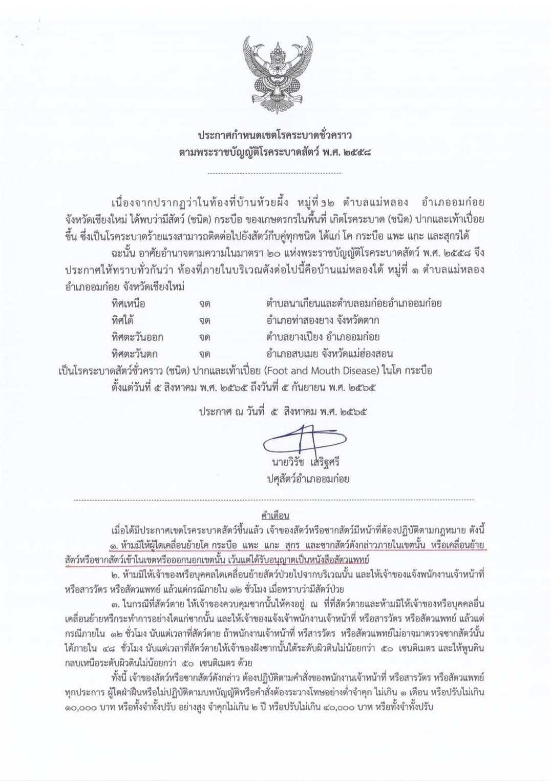 ตั้งแต่ 5 สิงหาคม – 5 กันยายน 2565 ห้ามมิให้ภายในเขต หรือเคลื่อนย้ายสัตว์เข้าในเขตหรือออกนอกเขตนั้น เว้นแต่ได้รับอนุญาตเป็นหนังสือสัตวแพทย์