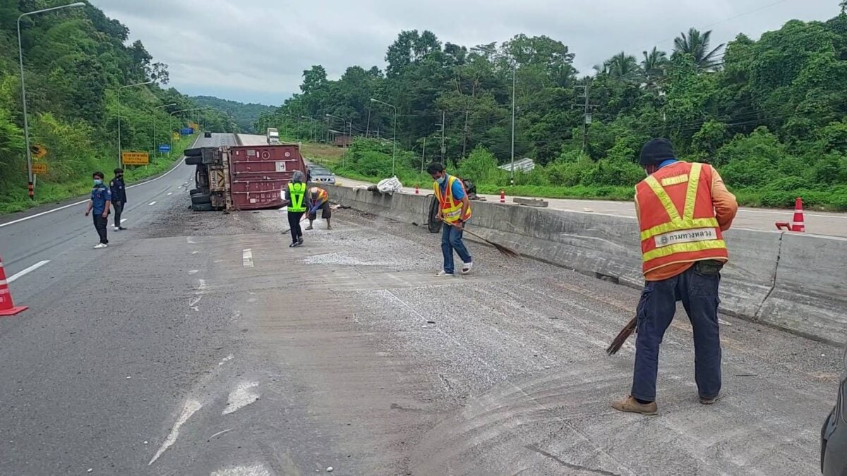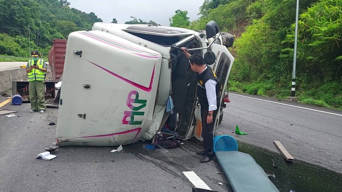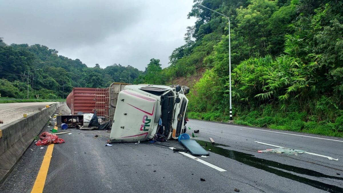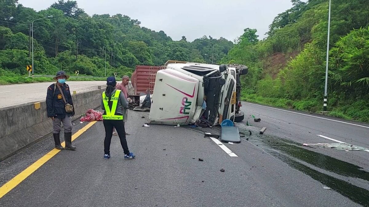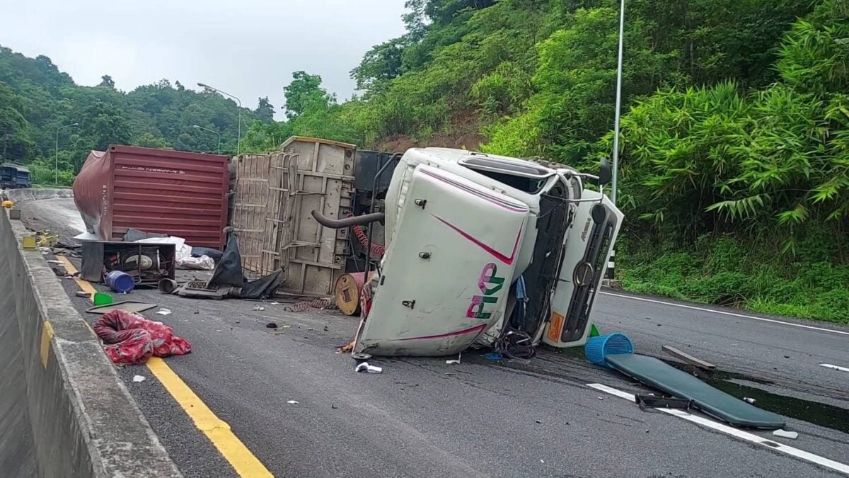 จ.ตาก รถพ่วงบรรทุกเม็ดพลาสติกเต็มคัน ส่งปลายทางประเทศเมียนมา ถึงทางลงเขา “เนินพิศวง” ทางไป อ.แม่สอด เกิดเสียหลักแหกโค้งพลิคว่ำบาดเจ็บ 1 ราย