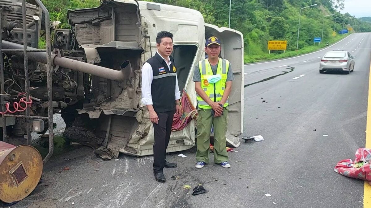 ที่เกิดเหตุพบรถบรรทุกพ่วง 22 ล้อ ฮีโน่ หัวลากสีขาว ทะเบียนพิษณุโลก สภาพพลิกคว่ำ นอกจากนี้ภายในรถมีผู้ได้รับบาดเจ็บ จำนวน 1 ราย เป็นชาย ทราบชื่อนายกิต อายุ 33 ปี ได้รับบาดเจ็บเล็กน้อย เจ้าหน้าที่หน่วยกู้ภัยให้การช่วยเหลือปฐมพยาบาลเบื้องต้นในที่เกิดเหตุ จากนั้นจึงนำตัวส่งโรงพยาบาลแม่สอด นอกจากนี้พบรถบรรทุกพ่วงกีดขวางถนน1 เลน มีน้ำมันไหลพื้นผิวถนนบริเวณ ฝั่งขาเข้ามุ่งหน้าในเขตเทศบาลนครแม่สอด ส่งผลทำให้การจราจรเกิดการชะลอตัว