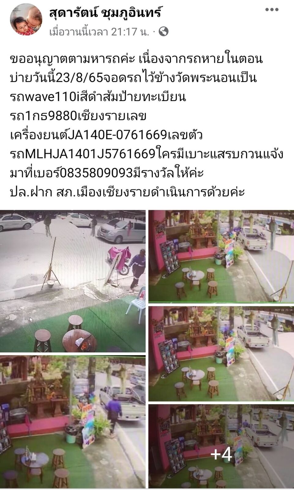 วันที่ 24 ส.ค. 65 ผู้สื่อข่าวติดตามกรณีมีผู้เสียหายโพสต์เฟสบุ๊กขอความช่วยเหลือ หลังจากมีโจรลักษณะเดินขากะเผลกแอบย่องมาขโมยรถจักรยานยนต์และขี่หลบหนีหายไร้ร่องรอย วอนโซเซียลช่วยแจ้งเบาะแส พร้อมมอบสินน้ำใจให้หากได้รถคู่กายคืน