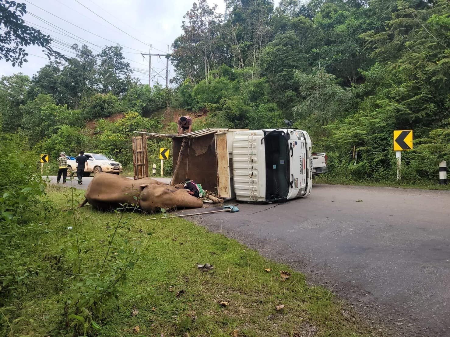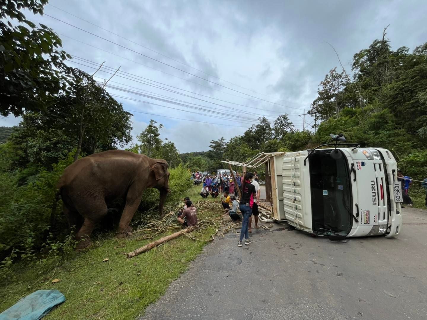หกล้อขนช้างไปหางานทำพลิกคว่ำ พลายคำเจ็บหนัก สมาคมสหพันธ์ช้างส่งทีมกู้ภัยช้างเข้าช่วยเหลือ