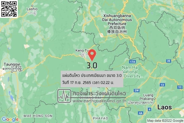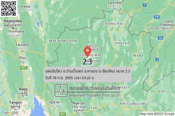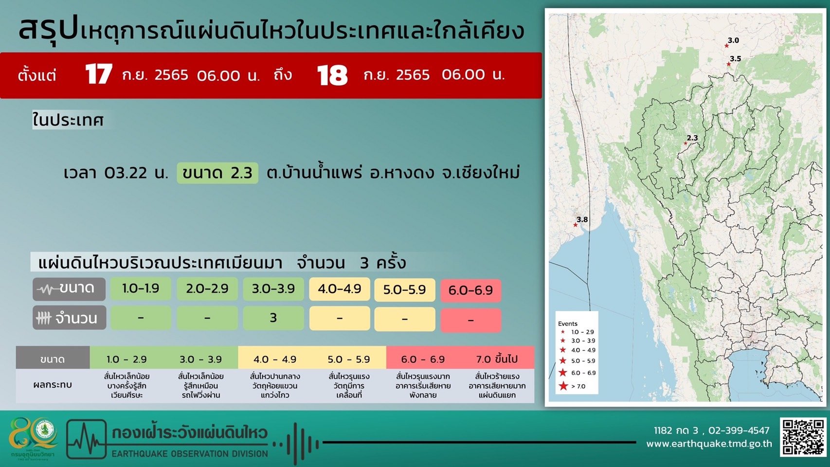 สถานการณ์แผ่นดินไหวในช่วงวันที่ 17-18 กันยายน 2565 ตรวจพบเหตุการณ์แผ่นดินไหว ขนาด 3.0,3.5 และ 3.8 มีศูนย์กลางอยู่ที่ประเทศเมียนมา ขนาด 2.3 มีศูนย์กลางอยู่ที่ ต.บ้านน้ำแพร่ อ.หางดง จ.เชียงใหม่ ซึ่งเป็นแผ่นดินไหวขนาดเล็ก ไม่มีผลกระทบต่อประเทศไทยแต่อย่างใด