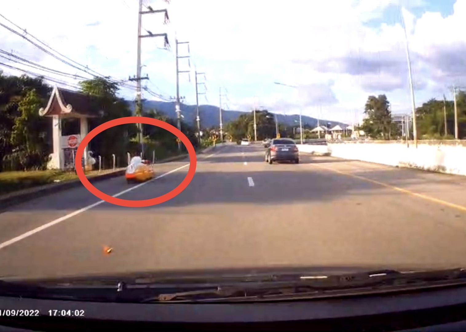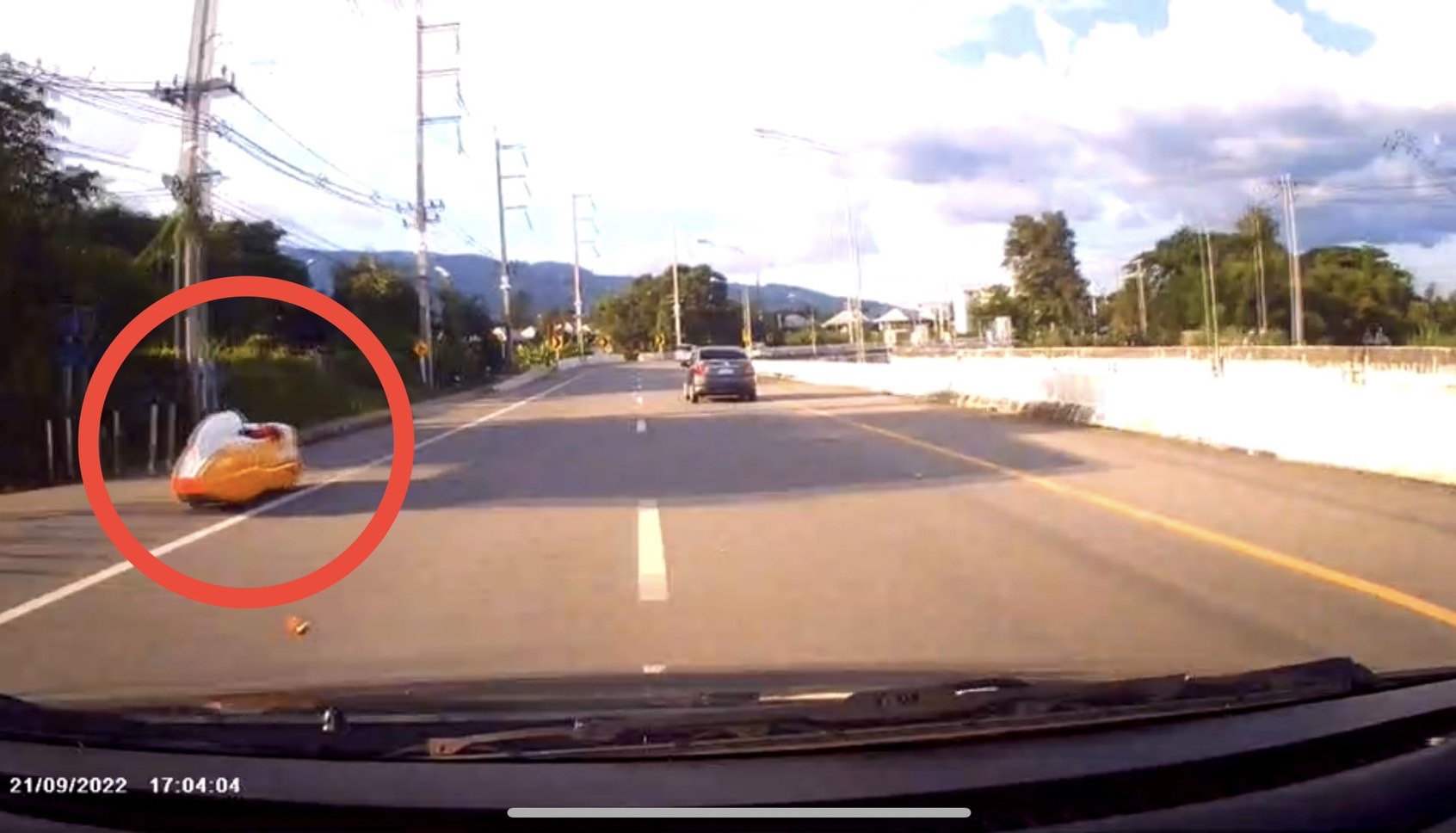 ภาพจากกล้องหน้ารถของประชาชนที่สัญจรบนถนนคันคลองชลประทาน จากสี่แยกต้นเกว๋นมุ่งหน้าสี่แยกพืชสวนโลก อ.หางดง จ.เชียงใหม่ ของช่วงเย็นวันที่ 21 ก.ย. ที่ผ่านมา บันทึกภาพของรถดัดแปลงลักษณะคล้ายแคปซูล สีเหลือง ที่วิ่งอยู่บนเลนถนนด้านซ้าย และมีการสัญญาณไฟกระพริบให้ผู้ที่ขับตามมาสังเกตเห็น ซึ่งคนขับเป็นชาวต่างชาติ แต่รถคันนี้ก็เป็นที่ท้วงติงของผู้ใช้รถใช้ถนนที่ยังคงเป็นห่วง เพราะคนเชียงใหม่มักจะเคยพบเห็นมาแล้วบ่อยครั้ง แต่สิ่งที่น่าเป็นห่วงเพราะรถแคปซูลคันนี้วิ่งอยู่บนถนนใหญ่ ที่มีรถราวิ่งอยู่จำนวนมาก โดยเฉพาะในช่วงเย็นที่เป็นชั่วโมงเร่งด่วน