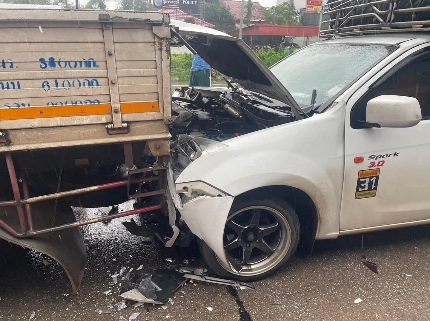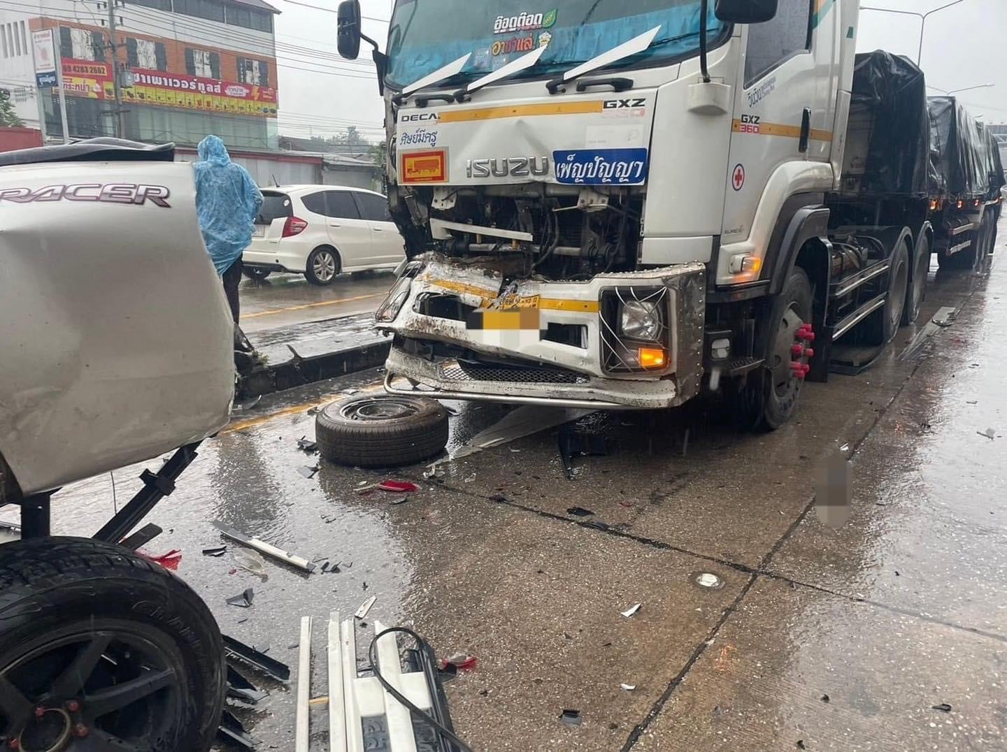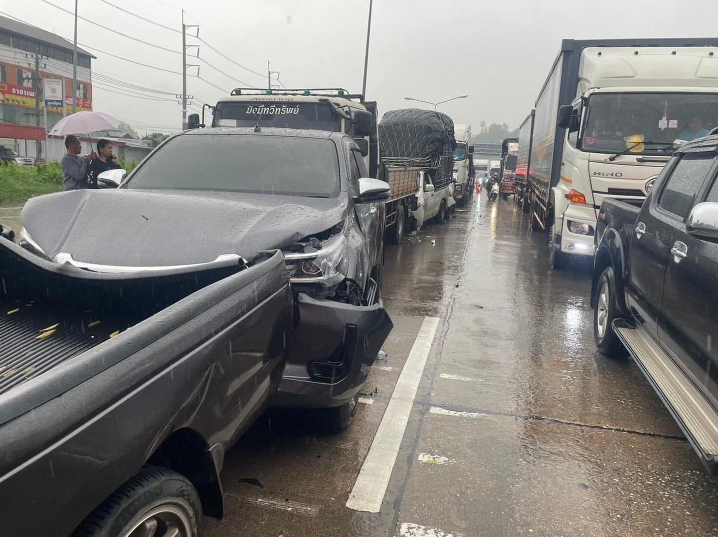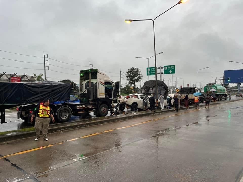 ที่เกิดเหตุพบเป็นรถยนต์และรถบรรทุกชนกันจำนวน7คัน ได้รับความเสียหายช่วงเวลานั้นมีฝกตกอย่างต่อเนื่อง ตรวจสอบผู้ขับขี่ได้รับบาดเจ็บเล็กน้อย เจ้าหน้าที่กู้ภัยตำรวจทางหลวง ให้ความช่วยเหลืออำนวยความสะดวกด้านสัญญาณไฟ ระหว่างเจ้าหน้าที่ตรวจสอบเหตุ เพื่อป้องกันเหตุซ้ำซ้อน..