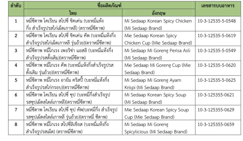 สำนักงานคณะกรรมการอาหารและยา (อย.) ตรวจสอบแล้ว ไม่พบการนำเข้าบะหมี่กึ่งสำเร็จรูปรุ่นที่พบการปนเปื้อนตามที่เป็นข่าวเข้ามาจำหน่ายในประเทศไทย ทั้งนี้ อย. ได้ตรวจสอบสถานที่นำเข้าและเก็บตัวอย่างผลิตภัณฑ์บะหมี่กึ่งสำเร็จรูป ตราหมี่ซีดาพ รุ่นการผลิตที่นำเข้ามาในประเทศไทย เพื่อตรวจหาสารเอทิลีนออกไซด์ แจ้งสำนักงานสาธารณสุขจังหวัดตรวจสอบเฝ้าระวังการจำหน่ายผลิตภัณฑ์ดังกล่าวทั่วประเทศ ขอความร่วมมือผู้ประกอบการให้ระงับการจำหน่ายผลิตภัณฑ์บะหมี่กึ่งสำเร็จรูป ตราหมี่ซีดาพ จำนวน 8 รายการ จนกว่าจะทราบผลตรวจวิเคราะห์ รายละเอียดตาม QR Code