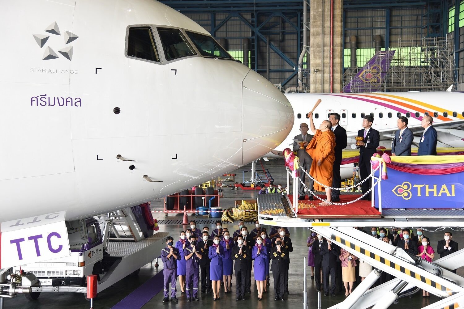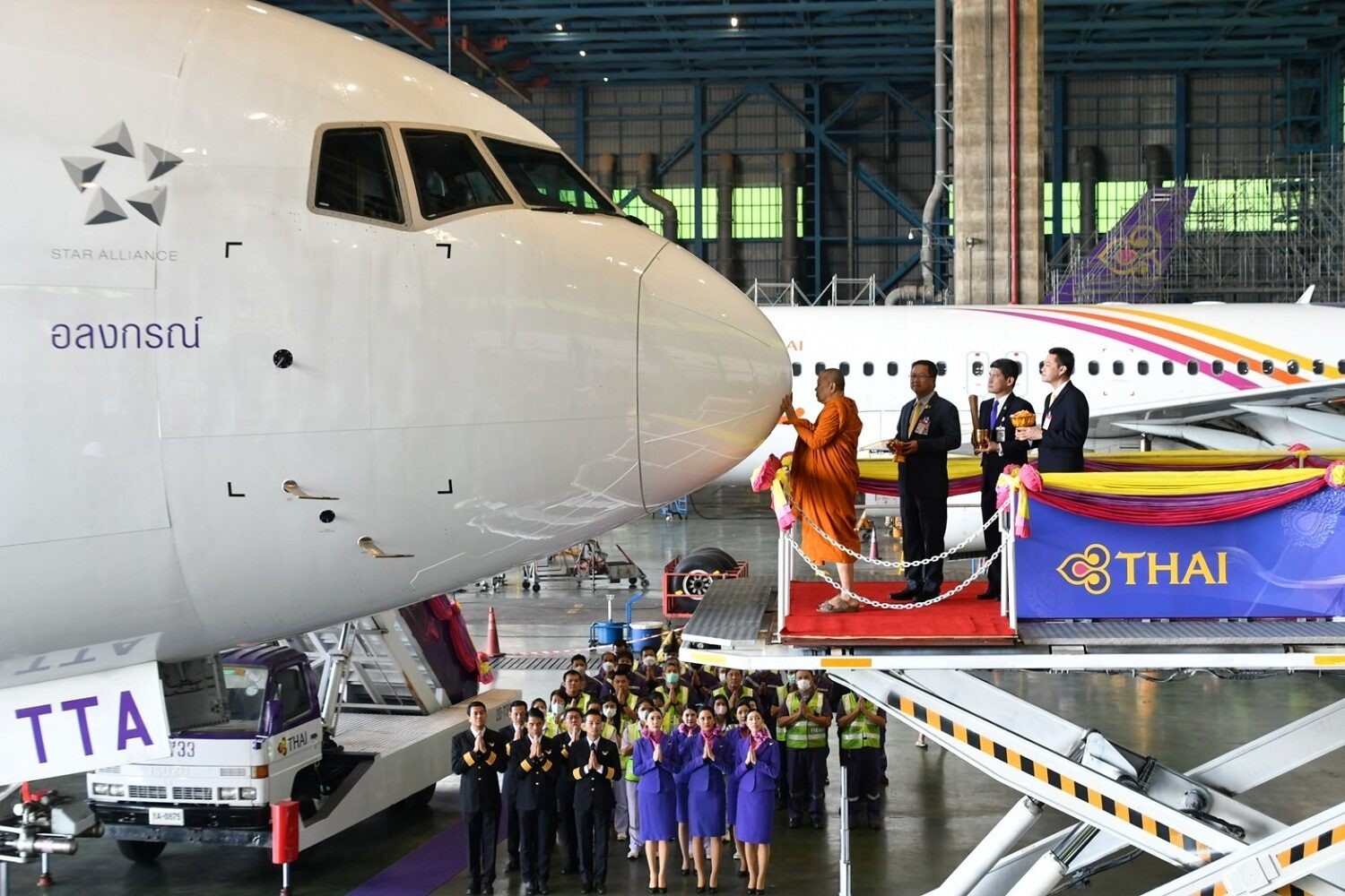 ประชาสัมพันธ์ บริษัท การบินไทย จำกัด(มหาชน) หรือ TG แจ้งว่า เมื่อวันที่ 18-19 ต.ค. 65 ที่ผ่านมา สมเด็จพระมหารัชมงคลมุนี หรือ สมเด็จธงชัย ผู้ช่วยเจ้าอาวาสวัดไตรมิตรวิทยาราม เจ้าคณะหนกลาง กรรมการมหาเถรสมาคม ประกอบพิธีเจิมเครื่องบินแบบโบอิ้ง 777-300ER นามพระราชทาน “อลงกรณ์” (ALONGKORN) และ “ศรีมงคล” (SIMONGKHON) ณ โรงซ่อมอากาศยาน (Hangar) สายช่าง การบินไทย สุวรรณภูมิ