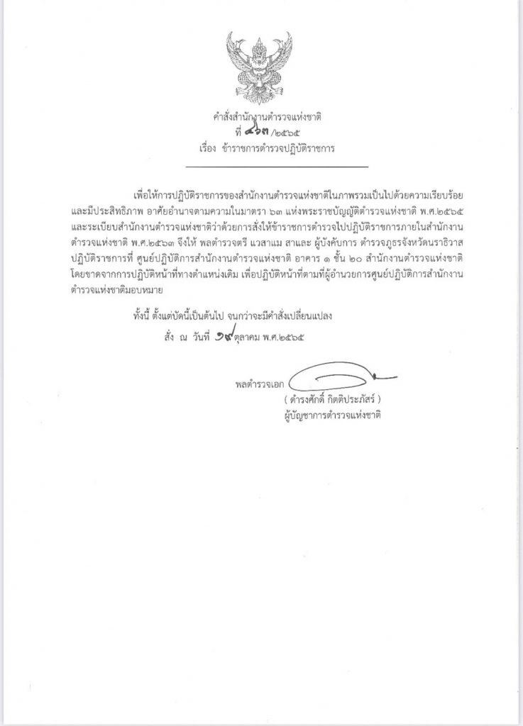 พลตำรวจเอกดำรงศักดิ์ กิตติประภัสร์ ผู้บัญชาตำรวจแห่งชาติ ลงนามในคำสั่ง เรื่อง ข้าราชการตำรวจปฏิบัติราชการ ให้พลตำรวจตรี แวสาแม สาและ ผู้บังคับการตำรวจภูธรจังหวัดนราธิวาส มาปฏิบัติราชการที่ศูนย์ปฏิบัติการสำนักงานตำรวจแห่งชาติ อาคาร 1 ชั้น 20 สำนักงานตำรวจแห่งชาติ โดยขาดจากการปฏิบัติหน้าที่ทางตำแหน่งเดิม เพื่อปฏิบัติหน้าที่ตามที่ผู้อำนวยการศูนย์ปฏิบัติการสำนักงานตำรวจแห่งชาติมอบหมาย โดยมีผลตั้งแต่วันที่ 19 ตุลาคมเป็นต้นไป จนกว่าคำสั่งจะเปลี่ยนแปลง