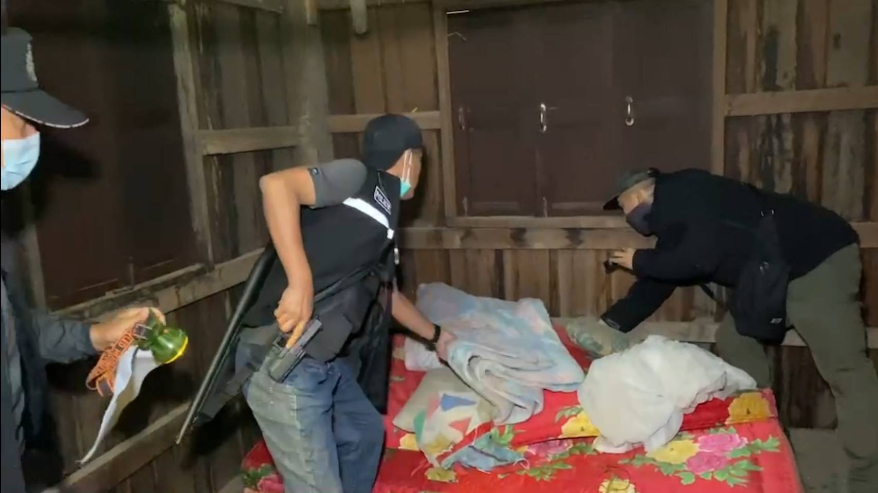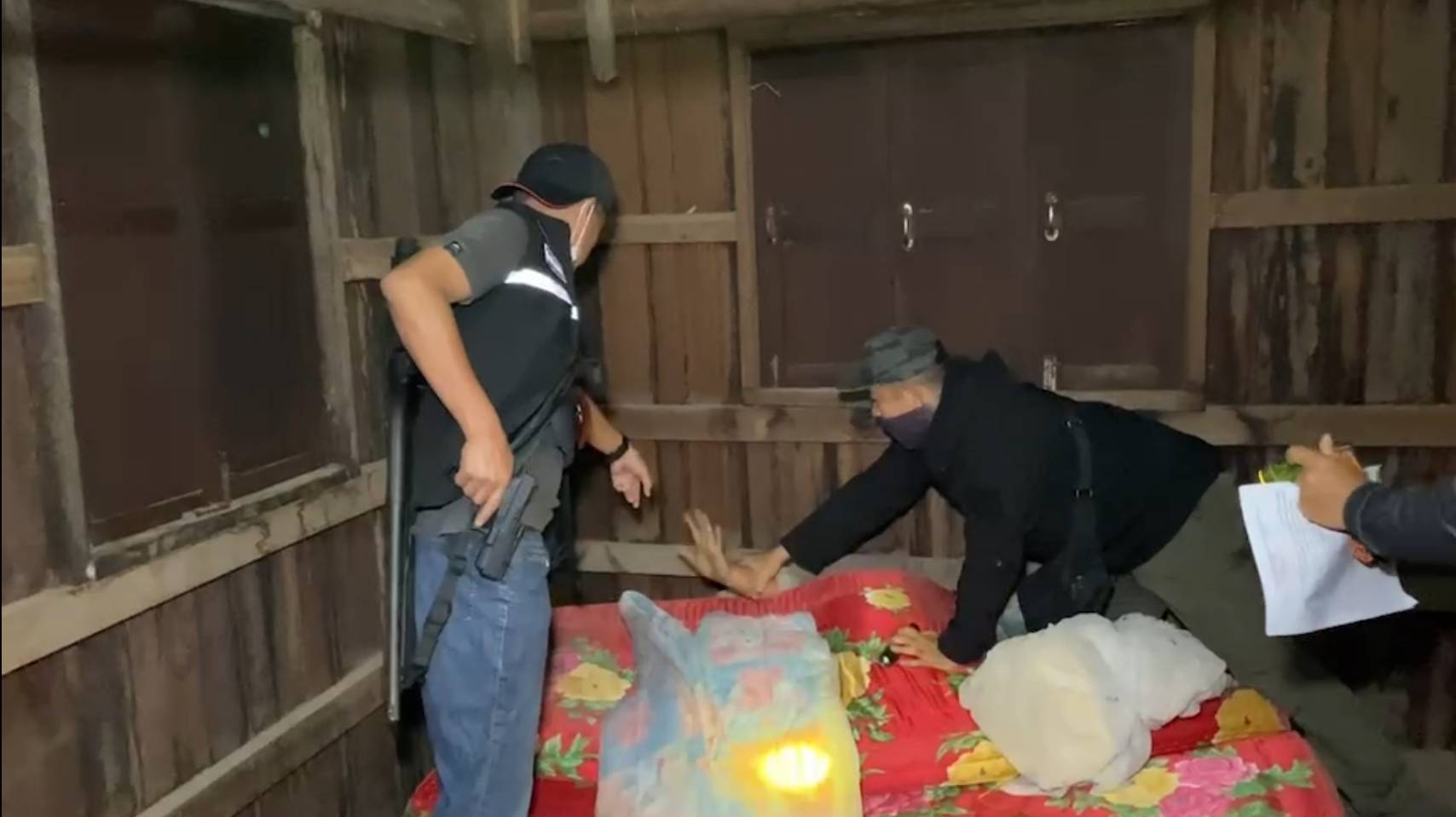 โดยเจ้าหน้าที่ได้นำหมายค้น จากศาลจังหวัดน่าน เข้าตรวจค้นแต่เรียกอยู่นาน ผู้ต้องสงสัยก็ไม่ยอมเปิดประตู แต่สังเกตพบว่ามีคนอยู่ข้างในบ้าน เจ้าหน้าที่จึงบุกจู่โจมเข้าทางหลังบ้านซึ่งไม่มีประตู ผู้ต้องสงสัยทราบชื่อในเวลาต่อมาชื่อว่านายบอล ได้ปีนหน้าต่างบริเวณชั้น 2 ของตัวบ้านออกไปทางหลังคาเพื่อจะกระโดดหลบหนี แต่เมื่อออกไปเจอเจ้าหน้าที่ที่ปิดล้อมอยู่ จึงกลับเข้ามาซ่อนตัว
