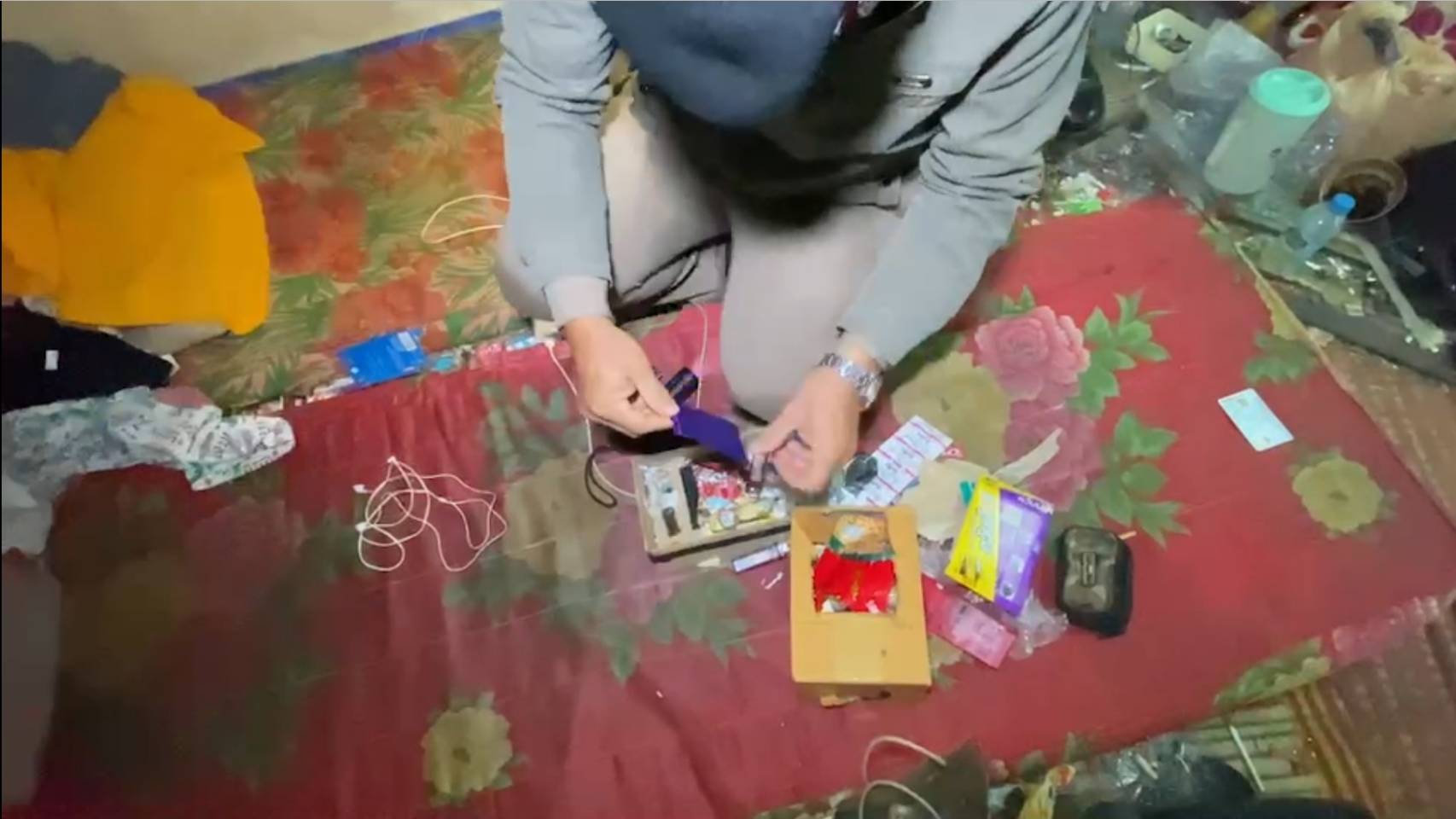 โดยภายในบริเวณบ้านมีสภาพรกรุงรัง ขยะทั้งอุปกรณ์การเสพ ก้นบุหรี่ รวมทั้งขวดเหล้าขวดเบียร์ ซองขนมทิ้งเกลี่ยนมีว่างเฉพาะที่นอนเท่านั้น บนบ้านมีสุ่มไก่ชน เจ้าหน้าที่พบผู้ต้องสงสัยอีกคนชื่อนายบอม เข้าไปหลบในสุ่มไก่ และบริเวณห้องน้ำพบเยาวชนชายวัย 17 ปี หลบซ่อนอยู่