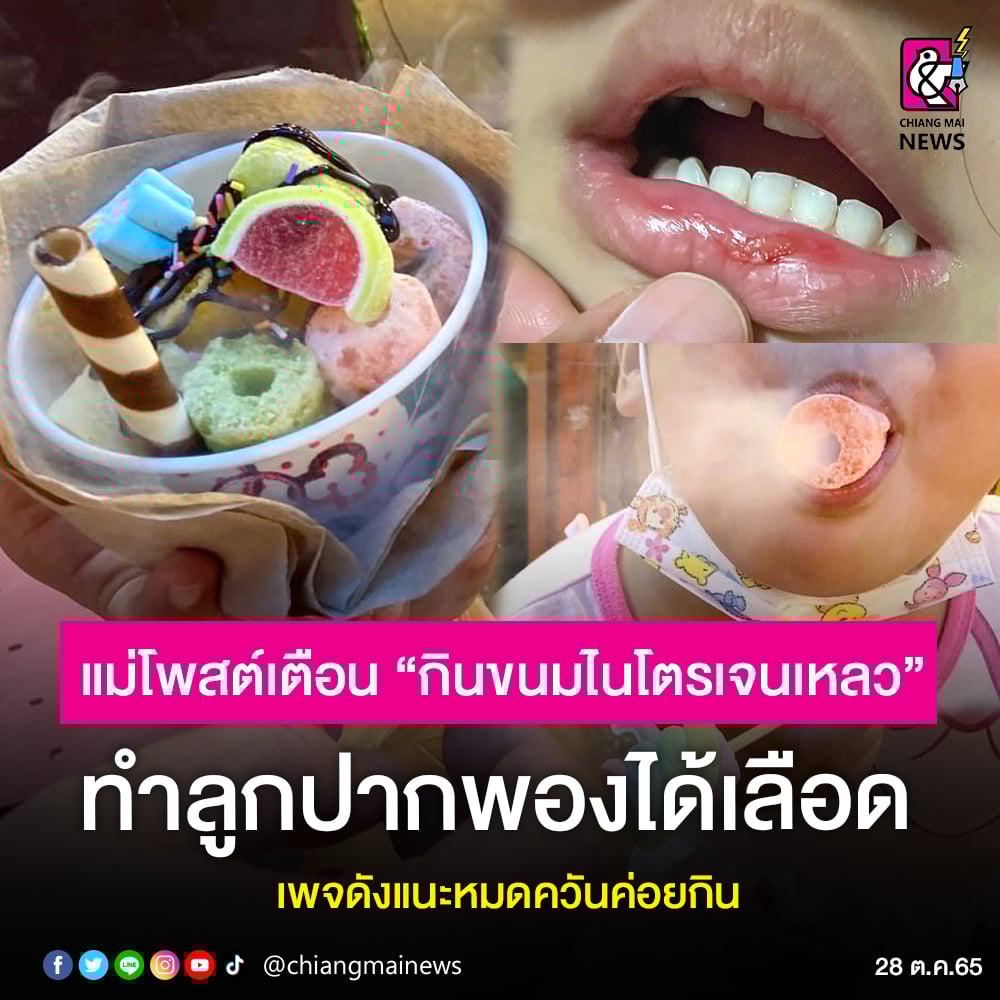 แม่โพสต์เตือน “กินขนมไนโตรเจนเหลว” ไม่รอระเหย ทำลูกปากพองได้เลือด เพจดังแนะหมดควันค่อยกิน