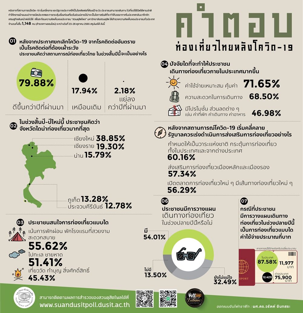 เผยว่า สวนดุสิตโพล มหาวิทยาลัยสวนดุสิต สำรวจความคิดเห็นของประชาชนทั่วประเทศ จำนวนทั้งสิ้น 1,148 คน (สำรวจทางออนไลน์) ระหว่างวันที่ 23-28 ตุลาคม 2565 พบว่า กลุ่มตัวอย่างคิดว่าสถานการณ์ท่องเที่ยวไทยในช่วงสิ้นปีนี้จะดีขึ้นกว่าปีที่ผ่านมา ร้อยละ 79.88 จังหวัดที่น่าท่องเที่ยวมากที่สุดในช่วงสิ้นปี-ปีใหม่นี้ คือ เชียงใหม่ ร้อยละ 38.85 ส่วนใหญ่สนใจการท่องเที่ยวแบบเน้นการพักผ่อน พักโรงแรมที่สวยงาม สะดวกสบาย ร้อยละ 55.62 ปัจจัยที่จะทำให้ประชาชนเดินทางท่องเที่ยวภายในประเทศมากขึ้น คือ ค่าใช้จ่ายเหมาะสม คุ้มค่า ร้อยละ 71.65 ทั้งนี้รัฐบาลควรเร่งดำเนินการส่งเสริมการท่องเที่ยวด้วยการกำหนดให้เป็นวาระแห่งชาติ กระตุ้นการท่องเที่ยวทั้งในประเทศและจากต่างประเทศ ร้อยละ 60.16 ส่งเสริมการท่องเที่ยวเมืองหลักและเมืองรอง ร้อยละ 57.34 เมื่อถามว่ามีการวางแผนเดินทางท่องเที่ยวในช่วงปลายปีนี้หรือไม่ พบว่า ร้อยละ 54.01 ตอบว่ามีแผนเดินทางท่องเที่ยว โดยแบ่งเป็นการเที่ยวในประเทศ ร้อยละ 87.58 (คาดการณ์ ใช้จ่ายต่อทริปเฉลี่ยประมาณ 11,977 บาท) เที่ยวต่างประเทศ ร้อยละ 12.42 (คาดการณ์ใช้จ่ายต่อทริปเฉลี่ยประมาณ 75,900 บาท)