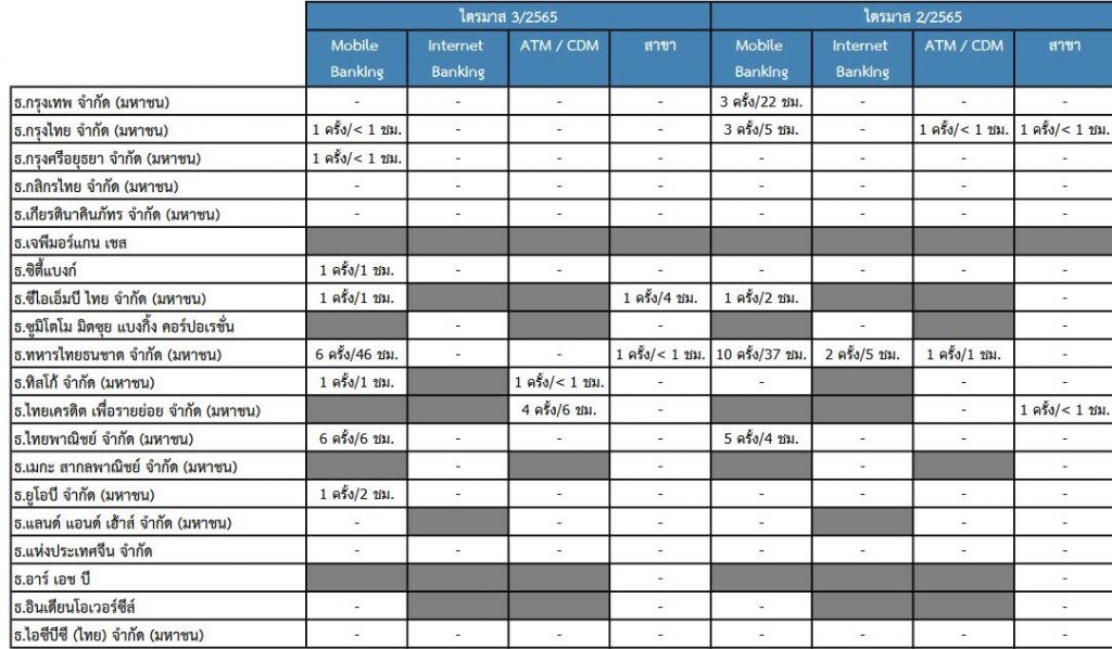 ทั้งนี้ เมื่อไตรมาสที่ 2 ปี 2565 ธนาคารทหารไทยธนชาต มีรายงานแอพพลิเคชั่นล่ม 10 ครั้ง ระยะเวลา 37 ชั่วโมง ส่วนไทยพาณิชย์ ล่ม 5 ครั้ง 4 ชั่วโมง ขณะที่ธนาคารกรุงเทพ ล่ม 3 ครั้ง 22 ชั่วโมง และกรุงไทย ล่ม 3 ครั้ง 5 ชั่วโมง ส่วนซีไอเอ็มบี ล่ม 1 ครั้ง 2 ชั่วโมง