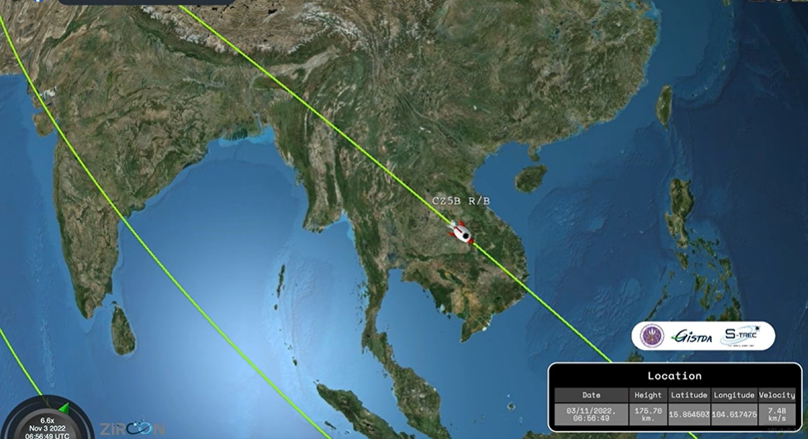 ศูนย์วิจัยเทคโนโลยีอวกาศของ GISTDA ใช้ระบบการจัดการจราจรอวกาศ (Space Traffic Management System) หรือ ZIRCON ในการติดตามและคาดการณ์การตกของชิ้นส่วนจรวดลองมาร์ช 5บี วาย4 (Longmarch 5B-Y4) ซึ่งพบว่า ชิ้นส่วนของจรวดดังกล่าวจะตกสู่พื้นโลกในวันเสาร์ที่ 5 พฤศจิกายน 2565 และอาจส่งผลกระทบกับประเทศไทยได้ เนื่องจากวัตถุอวกาศนี้ผ่านประเทศไทยทุกวัน (ตามภาพกราฟิกแสดงให้เห็นทิศทางการเคลื่อนตัวผ่านประเทศไทย) โดยวันนี้ (3 พ.ย.) จะโคจรในช่วงเวลาประมาณ 13:54 ถึง 13:56 น. พาดผ่านบริเวณพื้นที่บางส่วนของจังหวัดเชียงราย เชียงใหม่ พะเยา น่าน หนองคาย อุดรธานี กาฬสินธ์ ร้อยเอ็ด ยโสธร อำนาจเจริญ อุบลราชธานี สำหรับวัตถุอวกาศดังกล่าวขณะนี้โคจรสูงจากพื้นโลกโดยเฉลี่ยประมาณ 177 กิโลเมตร และมีน้ำหนักประมาณ 21.6 ตัน (ระหว่างที่วัตถุอวกาศกำลังตกสู่โลกนั้น จะมีน้ำหนักน้อยกว่านี้ เนื่องจากจะมีบางส่วนถูกเผาไหม้ในชั้นบรรยากาศ)