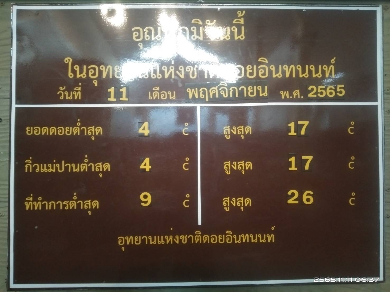 เมื่อเวลา 07.00 น. วันที่ 11 พ.ย. 65 นายเกรียงไกร ไชยพิเศษ หัวหน้าอุทยานแห่งชาติดอยอินทนนท์ อ.จอมทอง จ.เชียงใหม่ เปิดเผยว่าเช้านี้อากาศยังคงหนาวเย็นติดต่อนื่องกัน โดยอุณหภูมิเช้านี้วัดได้ต่ำสุด 4 องศาฯ บริเวณยอดดอย กิ่วแม่ปาน 4 องศาฯ ที่ทำการอุทยาน 9 องศาฯ และมีเหมยขาบติดต่อกันเป็นวันที่ 2 โดยเหมยขาบเกิดขึ้นขาวโพลนบนยอดหญ้าใบไม้ บริเวณทางขึ้นยอดดอย สำหรับสถิตินักท่องเที่ยวเมื่อวันที่ 10 พ.ย. 65 มีนักท่องเที่ยวเข้าเที่ยวชมดอยอินทนนท์ รวมทั้งไทยและต่างชาติ 3,218 คน