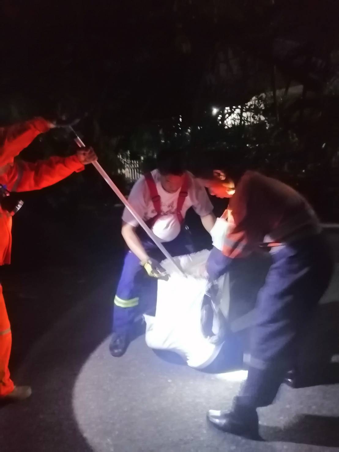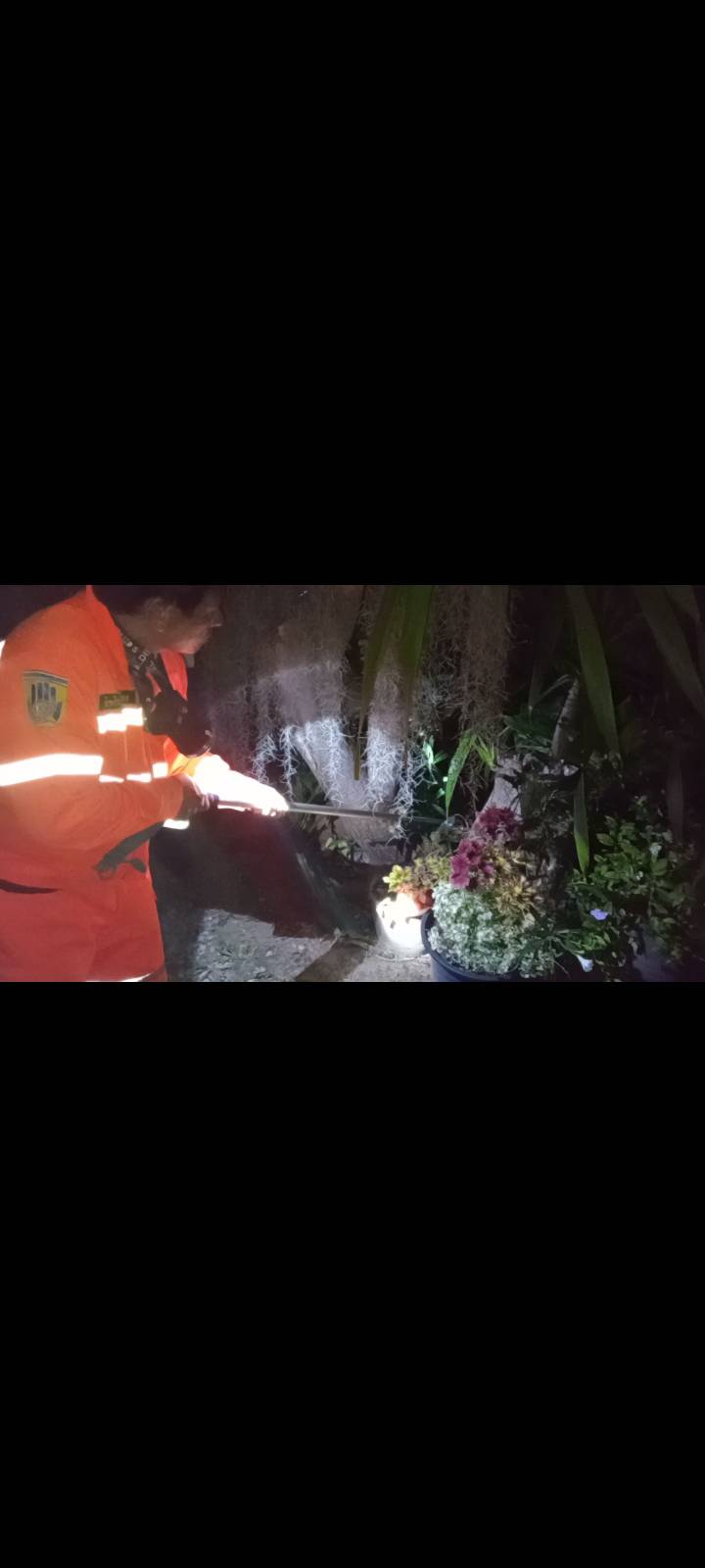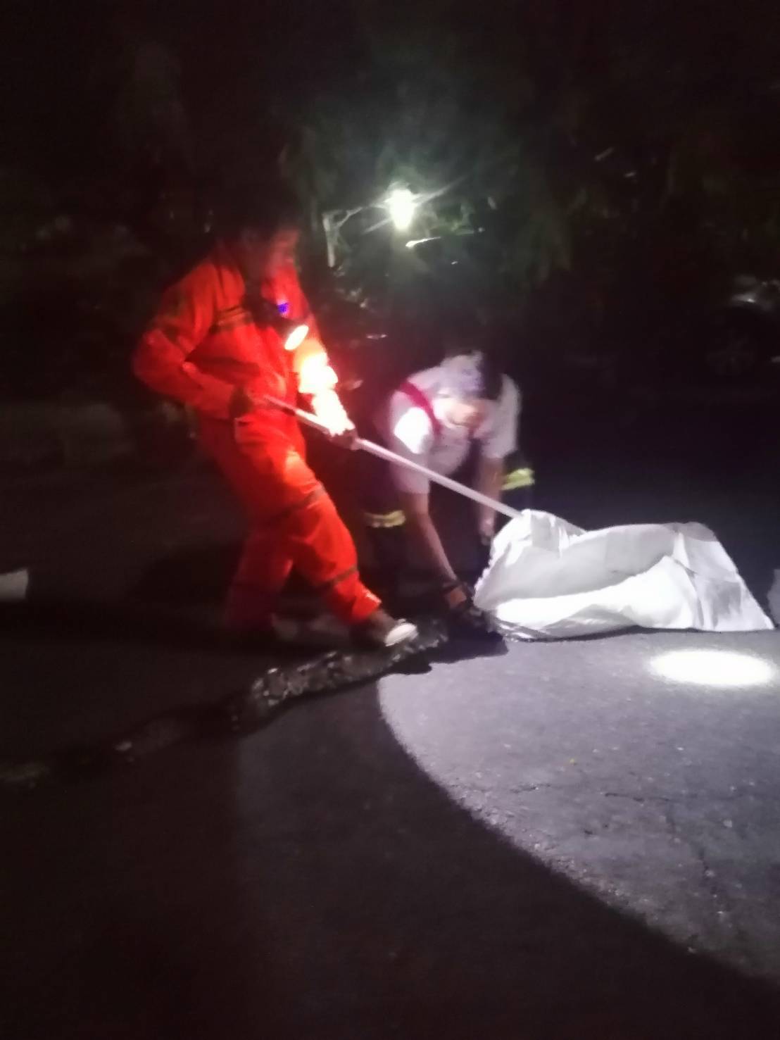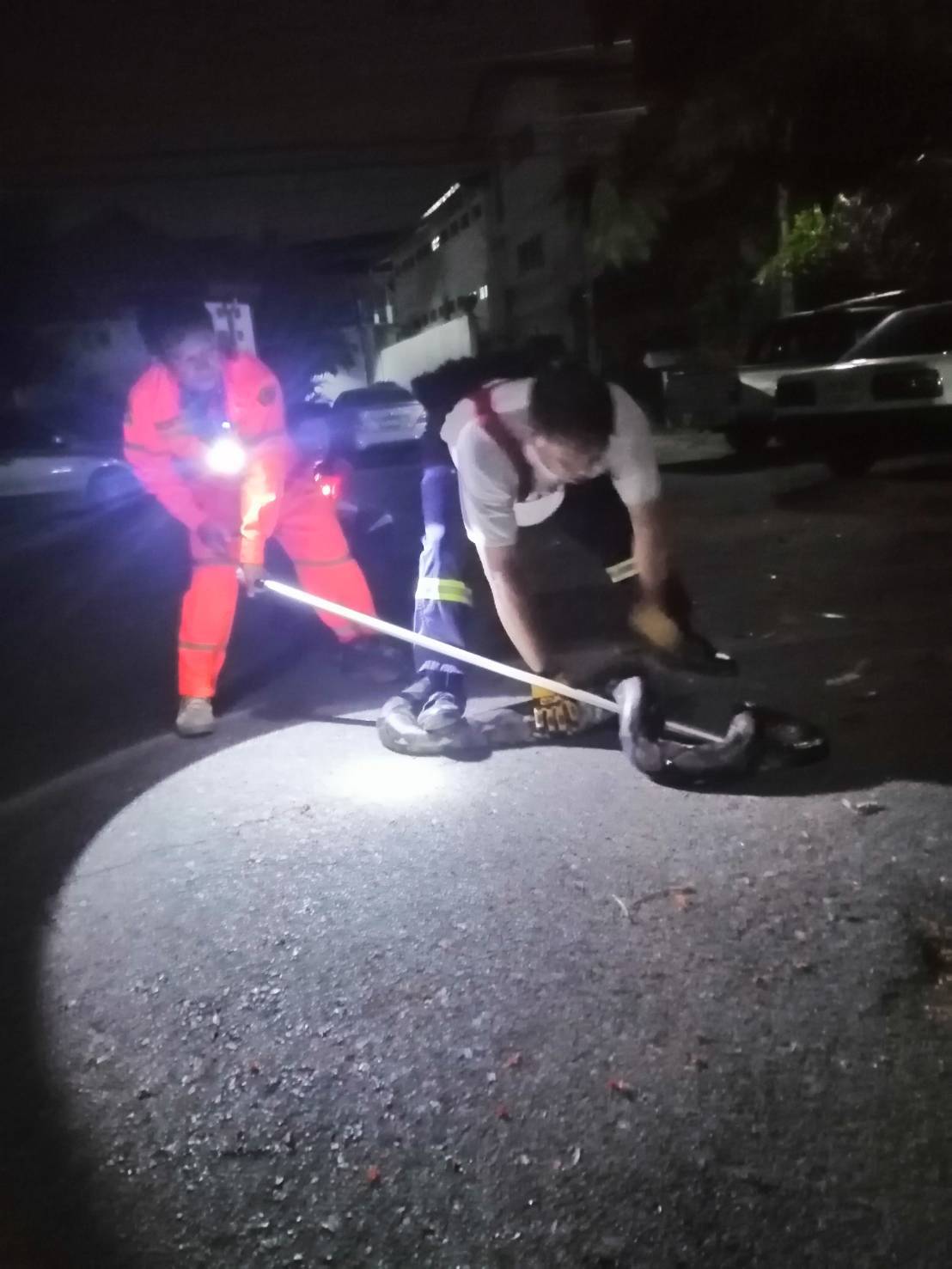 จึงใช้อุปกรณ์เข้าไปจับ โดยพบว่าบ้านหลังดังกล่าวเลี้ยงแมวไว้ คาดว่างูเหลือมออกมาหากิน หวังจะกินแมว แต่สุนัขเห่า และเจ้าของบ้านออกมาดูพบเป็นงู จึงแจ้งกู้ภัยจับเป็นงูเหลือมขนาดใหญ่ยาวประมาณ 3 เมตร จึงจับใส่กระสอบเพื่อไปปล่อยคืนสู่ธรรมชาติต่อไป