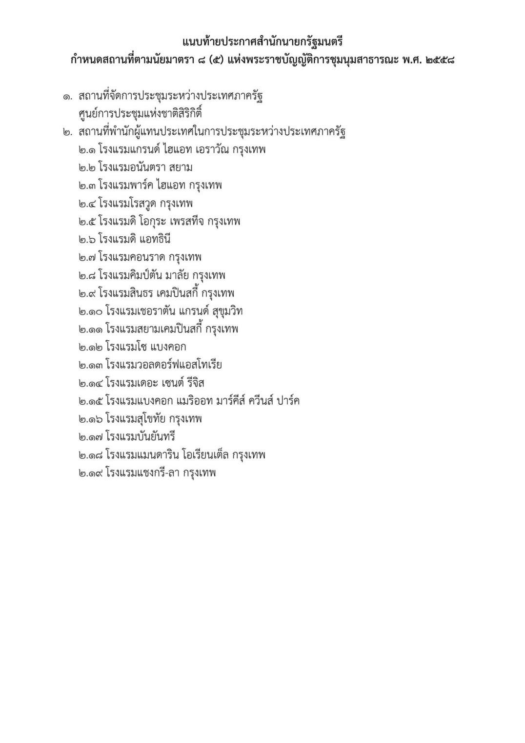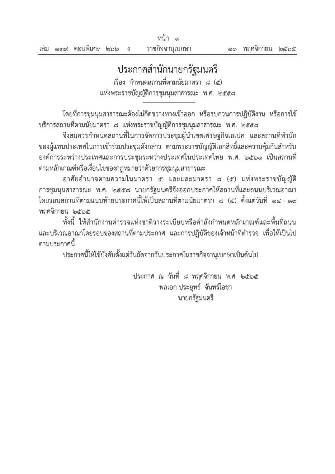 อาศัยอำนาจตามความในมาตรา 5 และและมาตรา 8 (5) แห่งพระราชบัญญัติการชุมนุมสาธารณะ พ.ศ. 2558 นายกรัฐมนตรีจึงออกประกาศให้สถานที่และถนนบริเวณอาณา โดยรอบสถานที่ตามแนบท้ายประกาศนี้ให้เป็นสถานที่ตามนัยมาตรา 8 (5) ตั้งแต่วันที่ 14 – 19พฤศจิกายน 2565