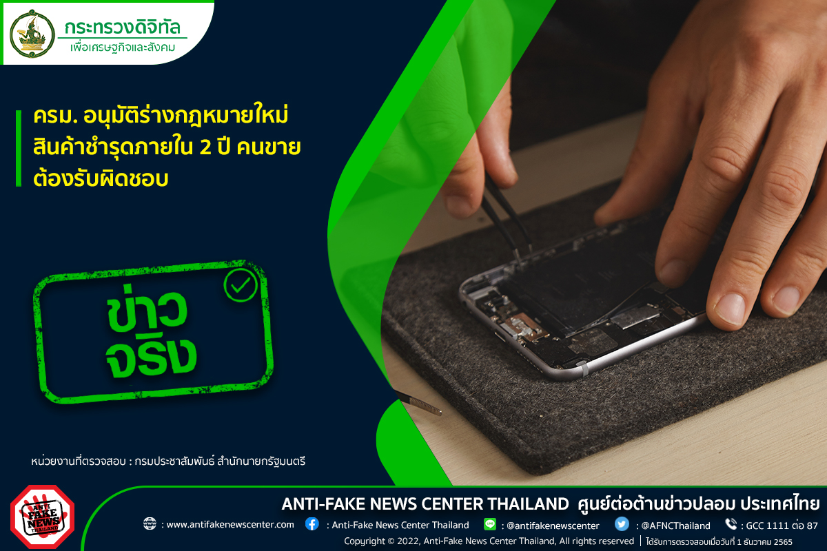 ตามที่มีการเผยแพร่ข้อมูลเกี่ยวกับประเด็นเรื่องครม. อนุมัติร่างกฎหมายใหม่ สินค้าชำรุดภายใน 2 ปี คนขายต้องรับผิดชอบ ทางศูนย์ต่อต้านข่าวปลอมได้ตรวจสอบข้อเท็จจริงโดยกรมประชาสัมพันธ์ สำนักนายกรัฐมนตรี พบว่าประเด็นดังกล่าวนั้น เป็นข้อมูลจริง