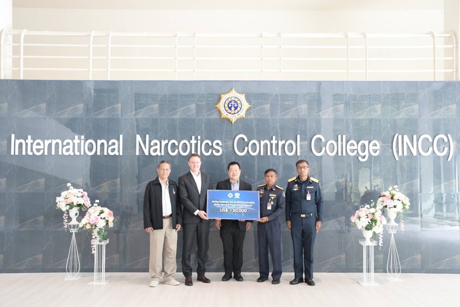 นายเจเรมี ดักลาส ยังได้เป็นผู้แทนมอบเงินสนับสนุนจาก UNODC โดยมีนายสำเริง ภูมิโคกรักษ์ ผู้อำนวยการวิทยาลัยป้องกันและปราบปรามยาเสพติดระหว่างประเทศ นายโชติพันธ์ จุลเพชร ผู้อำนวยการศูนย์ประสานงานแม่น้ำโขงปลอดภัย นายอภิกิต ฉ.โรจน์ประเสริฐ ผู้อำนวยการ สำนักงาน ปปส.ภ.5 เป็นผู้แทนรับ ภายใต้โครงการสนับสนุนวิทยาลัยป้องกันและปราบปรามยาเสพติดระหว่างประเทศ ของสำนักงาน ป.ป.ส. (Support to ONCB’s International Nacotics Control College) จำนวน 130,000 ดอลลาร์สหรัฐ เพื่อการพัฒนาวิทยาลัยป้องกันและปราบปรามยาเสพติดระหว่างประเทศ ของสำนักงาน ป.ป.ส. ให้เป็นศูนย์การเรียนรู้ด้านการป้องกันและปราบปรามยาเสพติดนานาชาติ ซึ่งจะรวบรวมหลักสูตรที่เกี่ยวข้องและมีประโยชน์แก่เจ้าหน้าที่บังคับใช้กฎหมายด้านยาเสพติดจากประเทศต่างๆ ในภูมิภาค และยังเป็นการสร้างสัมพันธภาพที่ดีระหว่างหน่วยงานบังคับใช้กฎหมายของไทยและต่างประเทศ อันจะนำไปสู่ความร่วมมือที่ดีต่อไป ซึ่งเป็นไปตามแนวนโยบายของ รมว.ยธ. นายสมศักดิ์ เทพสุทิน ที่ได้มอบหมายให้ สำนักงาน ป.ป.ส. แสวงหาความร่วมมือกับนานาประเทศ เพื่อป้องกันและแก้ไขปัญหายาเสพติด
