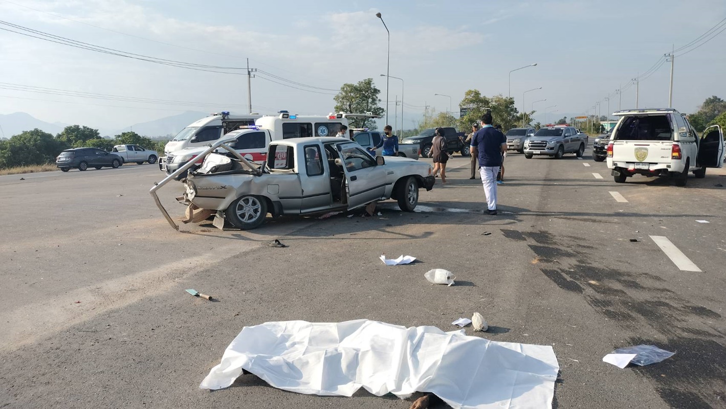 จากการสอบสวนเบื้องต้นทราบว่า ขณะที่คนขับรถกระบะนั่งด้านหน้า 2 คน และนั่งท้ายกระบะ 3 คน ได้ถูกรถบรรทุกทรายพุ่งชนท้ายอย่างแรง ทำให้คนนั้งท้ายกระบะ 3 คน กระเด็นออกจากรถเสียชีวิตคาที่ 2 ราย และคนขับรถกระบะ ได้กระเด็นออกนอกรถเช่นเดียวกัน จนมีทั้งเสียชีวิตและบาดเจ็บกันระนาวดังกล่าว