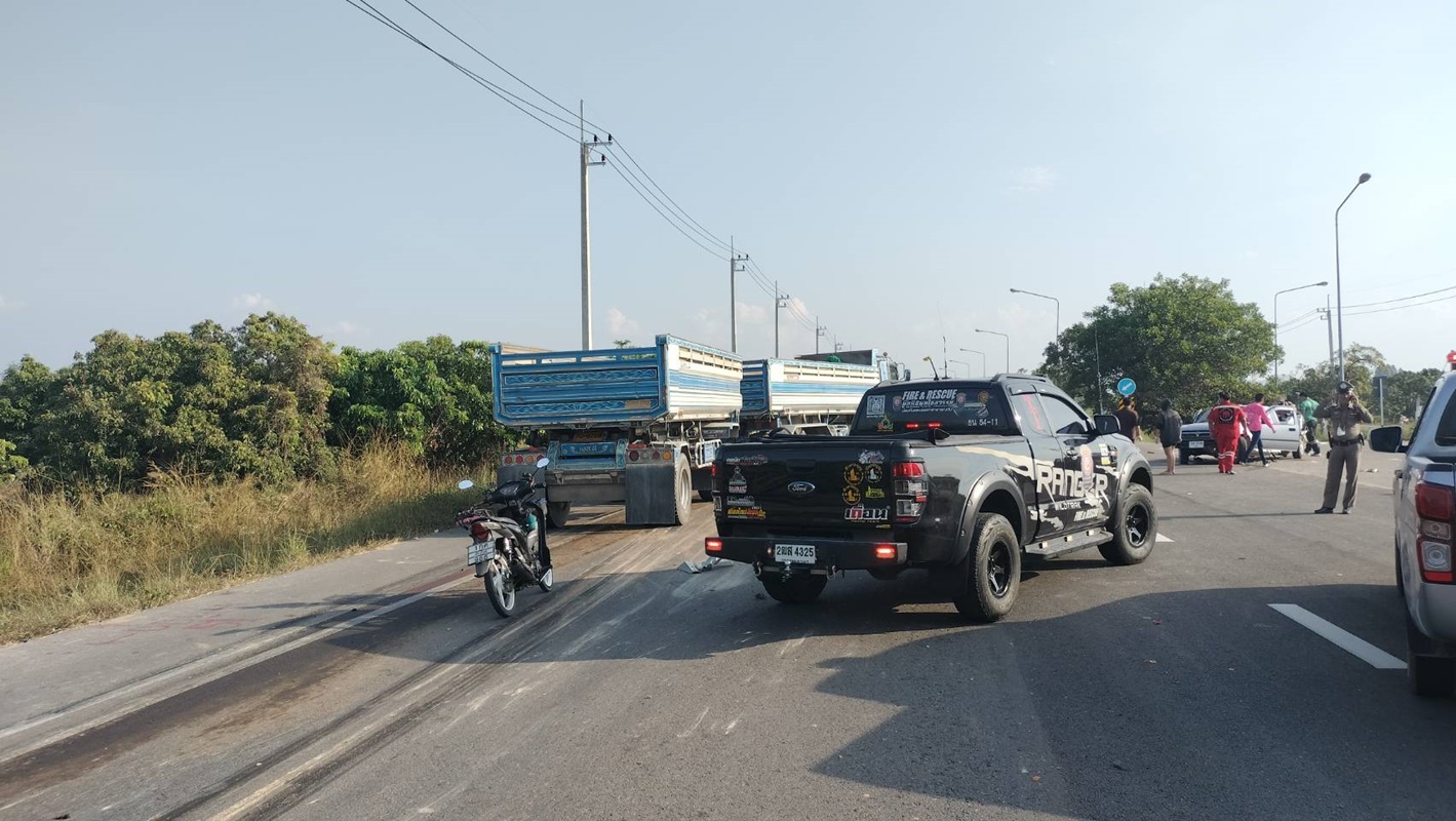 ในที่เกิดเหตุมีรถบรรทุกทราย 12 ล้อ สภาพด้านหน้ายุบ คนขับรอมอบตัวกับตำรวจ และมีรถกระบะโตโยต้า ไมตี้เอ๊กซ์ สีบรอนเงิน ทะเบียนเชียงใหม่ สภาพด้านท้ายยุบ