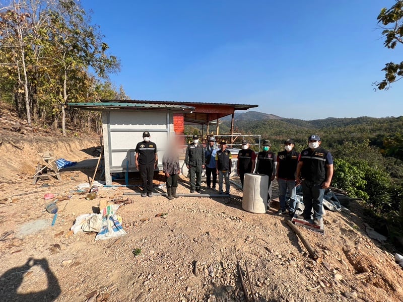 หินเจียร์ไฟฟ้า ยี่ห้อ มาร์กีต้า สีส้ม จำนวน 1 เครื่อง สายยางฉีดน้ำ สีน้ำเงิน ขนาดความยาว 10 เมตร จำนวน 1 เส้น ลังเหล็กเก็บอุปกรณ์เครื่องมือช่าง (ล็อคกุลแจไว้) จำนวน 1 ลัง กระบะพลาสติกผสมปูน จำนวน 1 ถัง ถังน้ำพลาสติก ขนาด 200 ลิตร สีน้ำเงิน จำนวน 1 ใบ จอบ จำนวน 1 ด้าม พลั่ว จำนวน 1 อัน ลูกกลิ้งทาสี จำนวน 2 อัน สายวัดระดับน้ำ จำนวน 1 เส้น ถังน้ำพลาสติก จำนวน 4 ใบ เกรียงฉาบปูน จำนวน 2 อัน แปรงทาสี จำนวน 2 ด้าม ค้อน จำนวน 1 ด้าม บันไดอะลูมิเนียม จำนวน 2 อัน เหล็กนั่งร้านสำหรับก่อสร้าง จำนวน 3 ชุด สายไฟฟ้าติดปลั๊กพ่วง จำนวน 1 เส้น อีเตอร์ด้ามเหล็ก จำนวน 1 ด้าม สายปั้มลม สีน้ำเงิน จำนวน 1 เส้น ตลับเมตร จำนวน 1 อัน ไม้บรรทัดวัดระดับน้ำ จำนวน 1 อัน และตรวจยึดพื้นที่ป่าบ้านโฮ่ง ในเขตป่าสงวนแห่งชาติป่าบ้านโฮ่ง เนื้อที่ 4 ไร่ 62 ตารางวา คิดค่าเสียหายของรัฐเบื้องต้นเป็นเงิน 283,520 บาท รวมของกลางที่ยึดได้ทั้งหมด 28 รายการ
