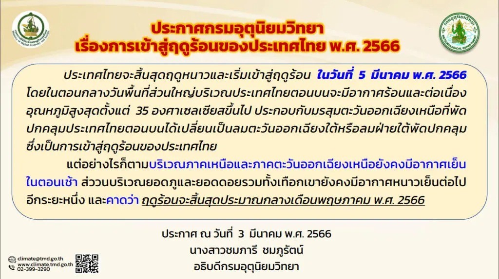 5 มีนาคมนี้ ประเทศไทยเข้าสู่ฤดูร้อนอย่างเป็นทางการ ช้ากว่ากำหนดปกติไป 3 สัปดาห์ จากกลางเดือนกุมภาพันธ์มาเป็นต้นเดือนมีนาคม โดยอุณหภูมิสูงสุดของฤดูร้อนปีนี้อยู่ในพื้นที่จังหวัดภาคเหนือ ที่สุโขทัย ตาก ลำปาง แม่ฮ่องสอน สูงถึง 40-43 องศาเซลเซียส จากสถิติเคยอากาศร้อนสุด 44.6 องศาเซลเซียส ที่ อ.เมือง จ.แม่ฮ่องสอน เมื่อปี 2559