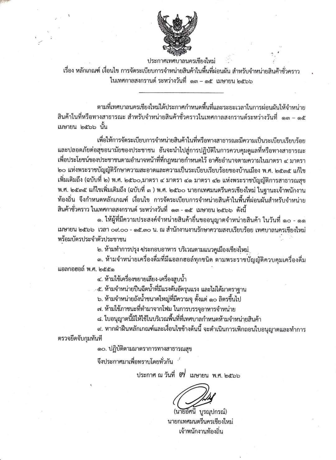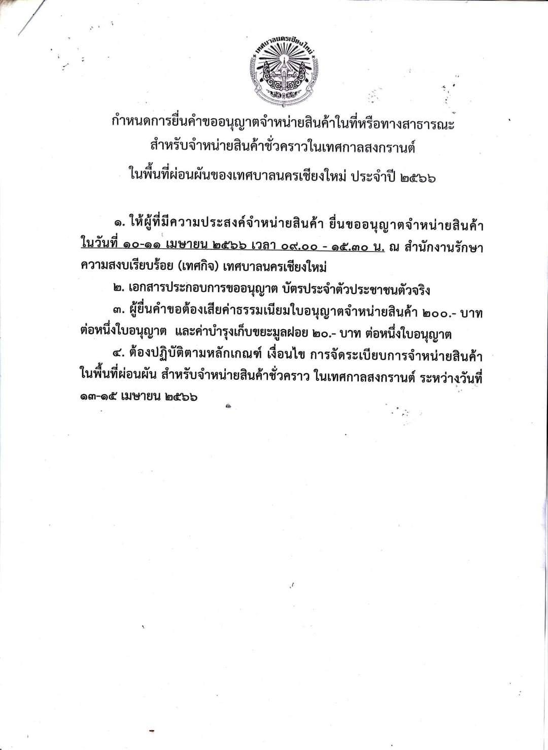 ข่าว ข่าวเด่น เชียงใหม่10 Apr 6610 Apr 23aaaum ด่วน! ยื่นขอขายของรอบคูเมือง ช่วงสงกรานต์ 66 10 Apr 66 💦กำหนดยื่นคำขออนุญาตจำหน่ายสินค้าในที่และทางสาธารณะ สำหรับจำหน่ายสินค้าชั่วคราวในเทศกาลสงกรานต์ 📑ผู้ใดสนใจสามารถยื่นคำขออนุญาตจำหน่ายสินค้าช่วงเทศกาลสงกรานต์ประจำปี 2566 ได้ที่ 📌งานรักษาความสงบเรียบร้อย สำนักปลัดเทศบาล ☎️ 053 232176 ในวันเวลาราชการ ร่วมแสดงความคิดเห็นFacebookFacebookXTwitterLINELine