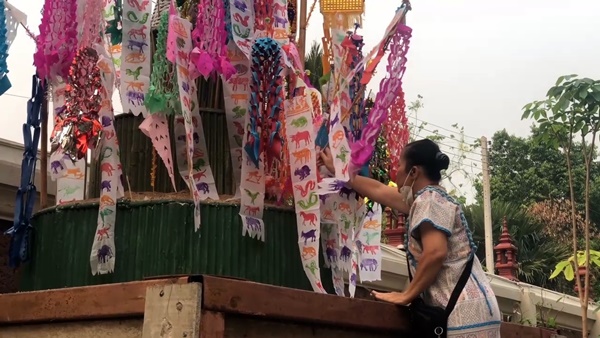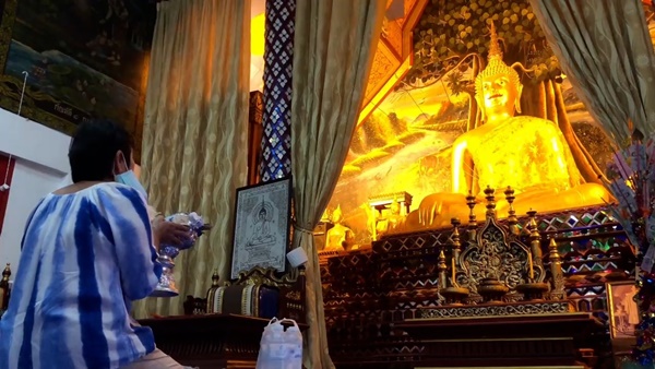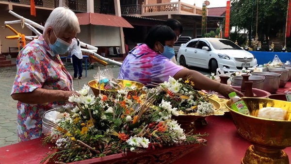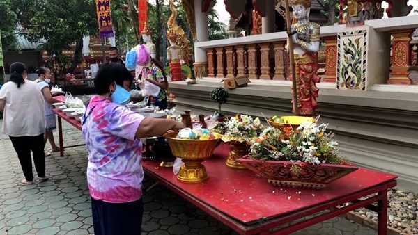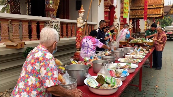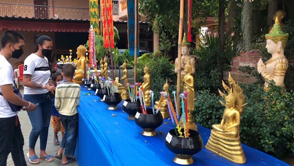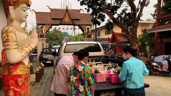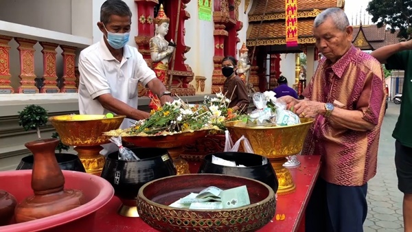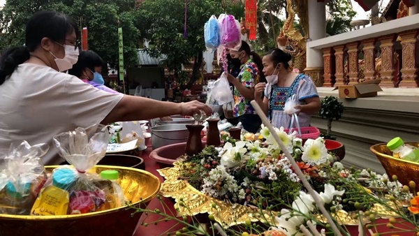 บรรยากาศตามวัดวาอารามต่างๆ ทั่วเชียงใหม่ในเช้านี้ก็มีประชาชน และนักท่องเที่ยว ตางก็พาครอบครัวออกมากราบพระเจ้าแสนแซ่ พระพุทธรูปเก่าแก่คู่เมืองเชียงใหม่อีกองค์หนึ่ง ร่วมทำบุญตานขันข้าว รับฟังเทศน์ ธรรม รับศีลรับพรสำหรับการก้าวเข้าสู่ปีใหม่ หลังจากนั้นก็จะพากันไปสรงน้ำพระขอพร และขนทรายเข้าวัด และปักตุงมงคล อย่างตุงไส้หมู และตุง 12 ราศี อย่างที่วัดท่าเดื่อ ต.สันผีเสื้อ ชาวบ้านในชุมชนก็ออกมาทำบุญสงน้ำพระกันอย่างคึกคัก