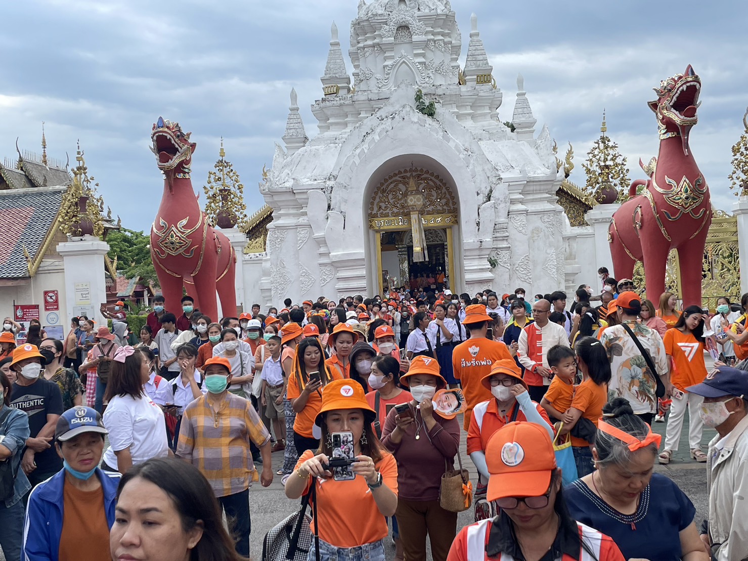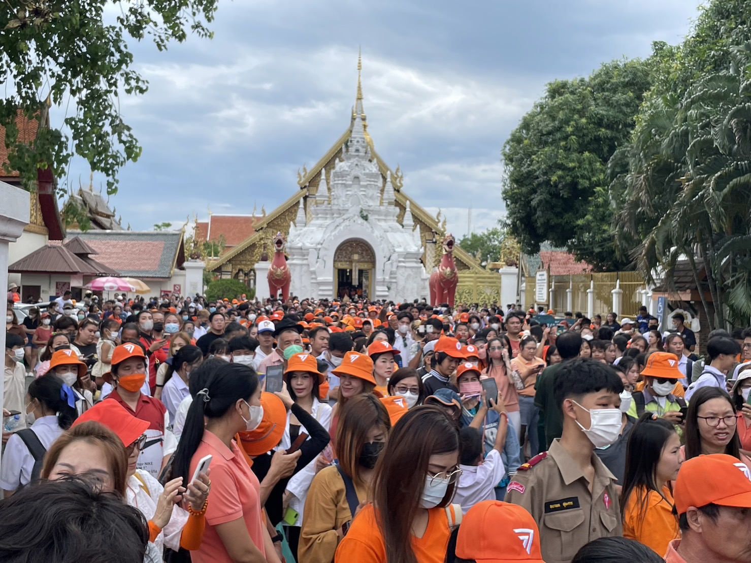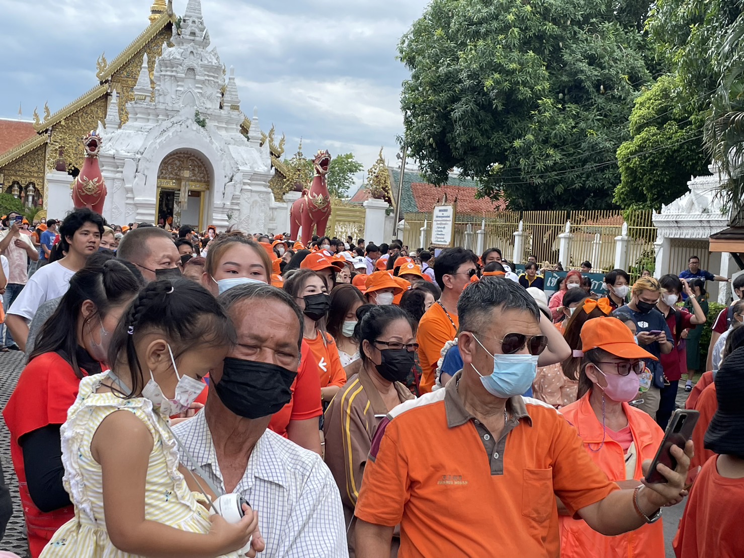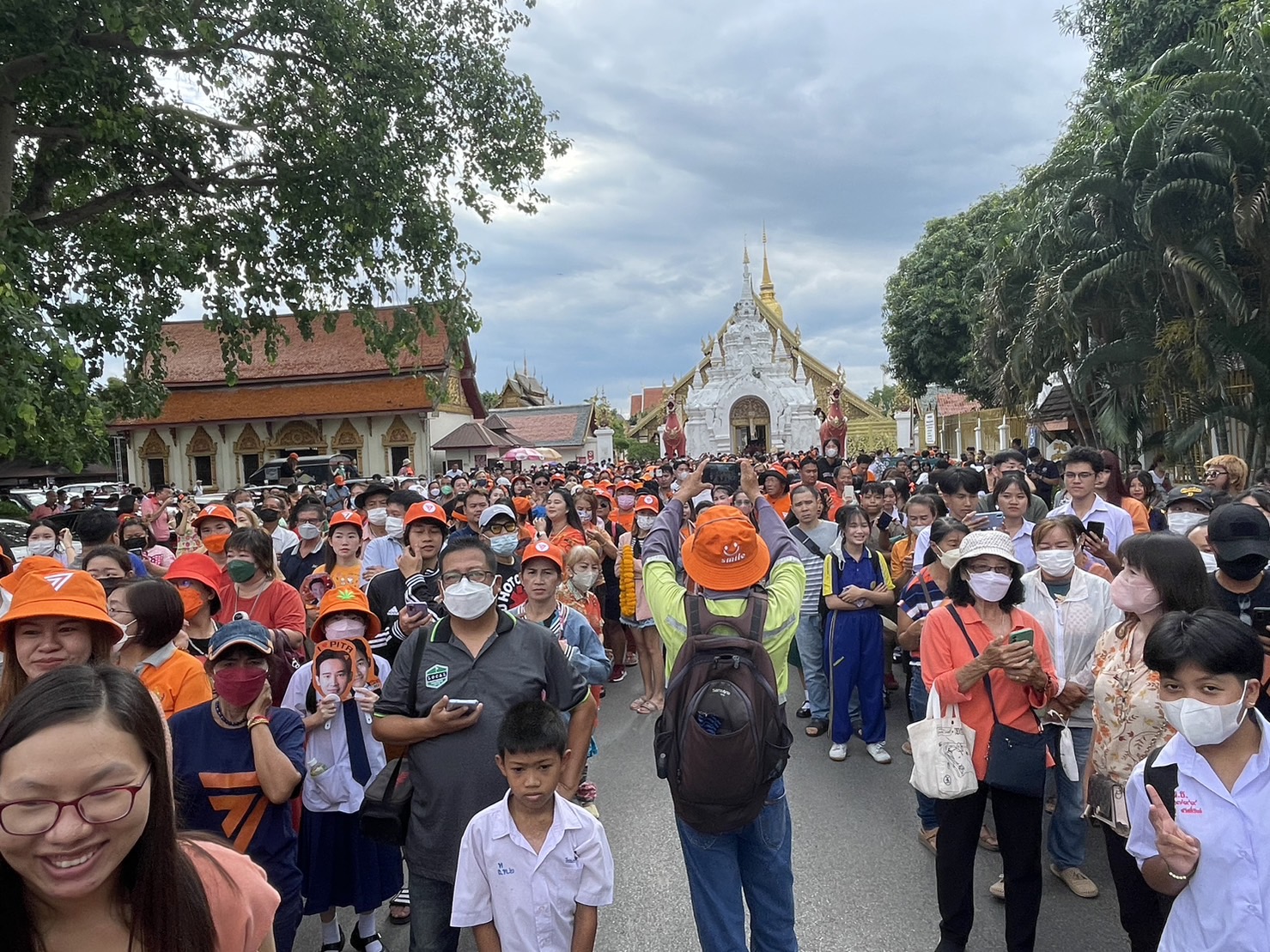ชาวลำพูนเฮ สีส้มพรึ่บแน่นหน้าวัดพระธาตุหริภุญชัย รอต้อนรับ พิธา ว่าที่นายกรัฐมนตรี