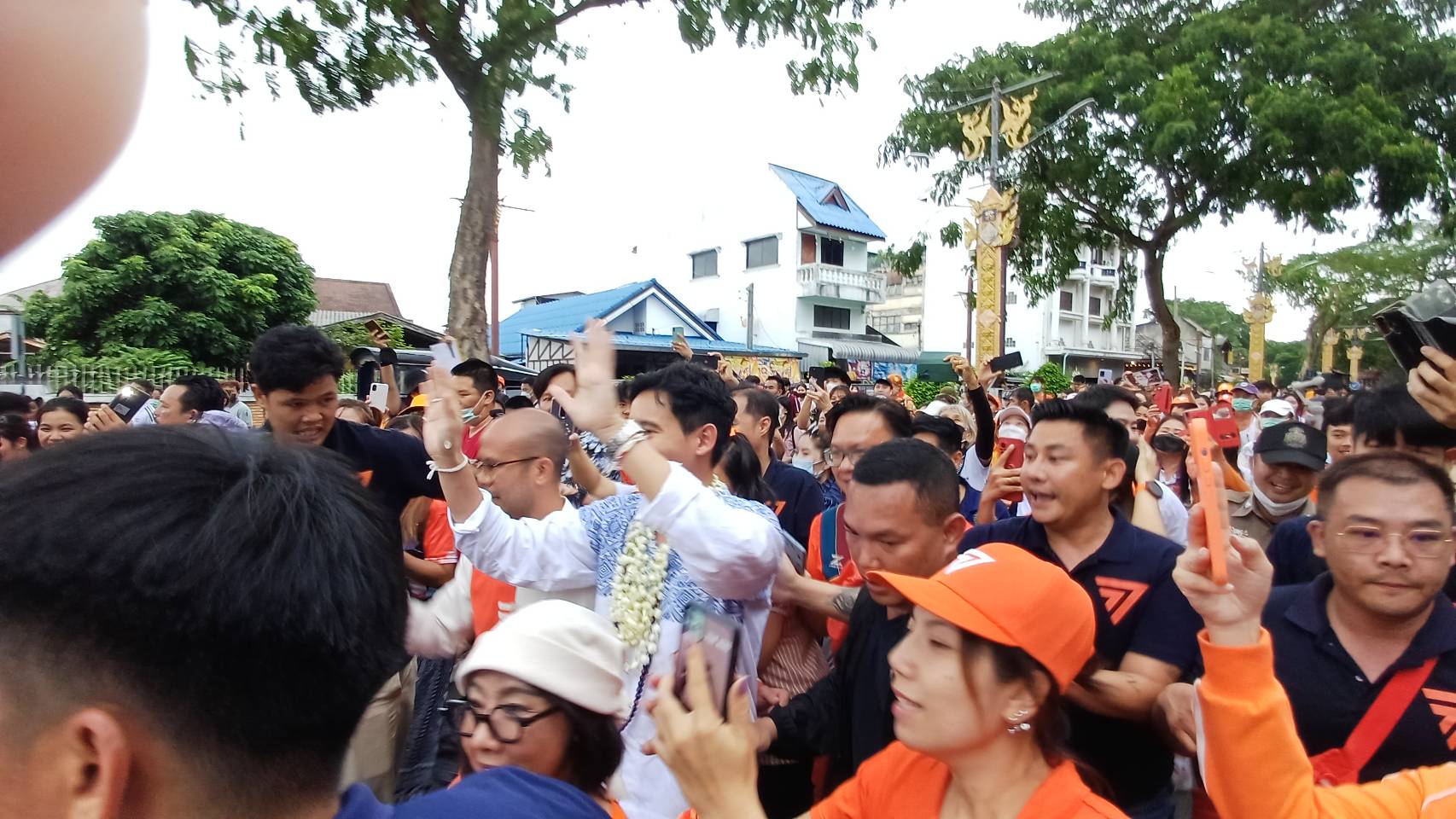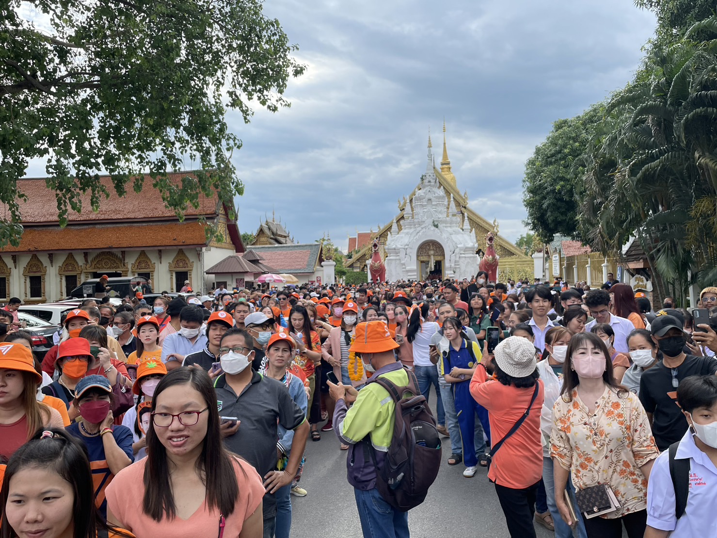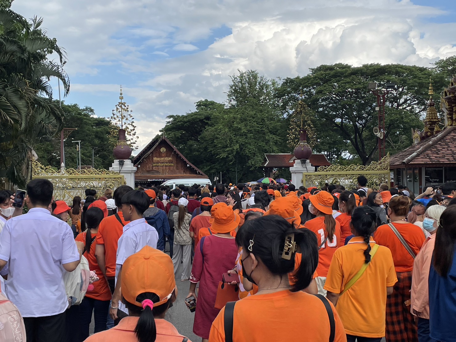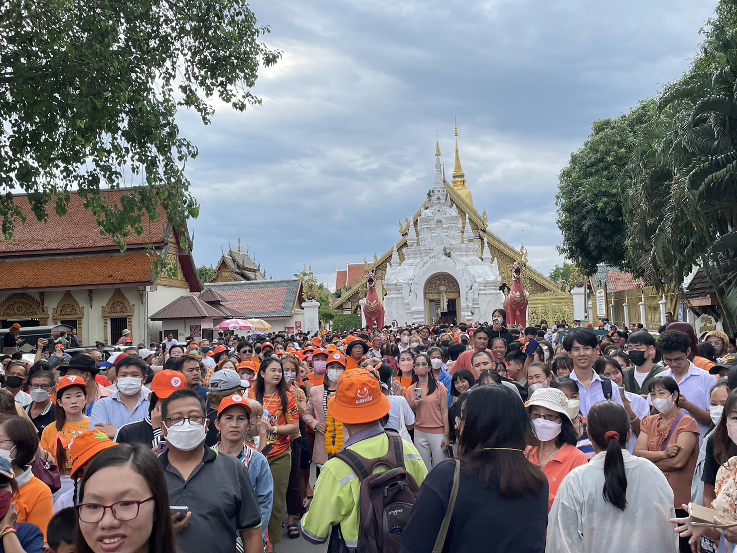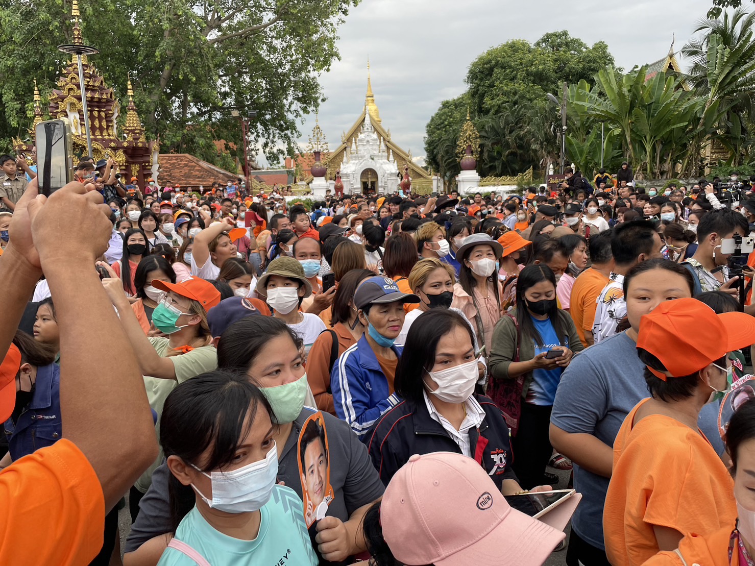 ชาวลำพูนเฮ สีส้มพรึ่บแน่นหน้าวัดพระธาตุหริภุญชัย รอต้อนรับ พิธา ว่าที่นายกรัฐมนตรี