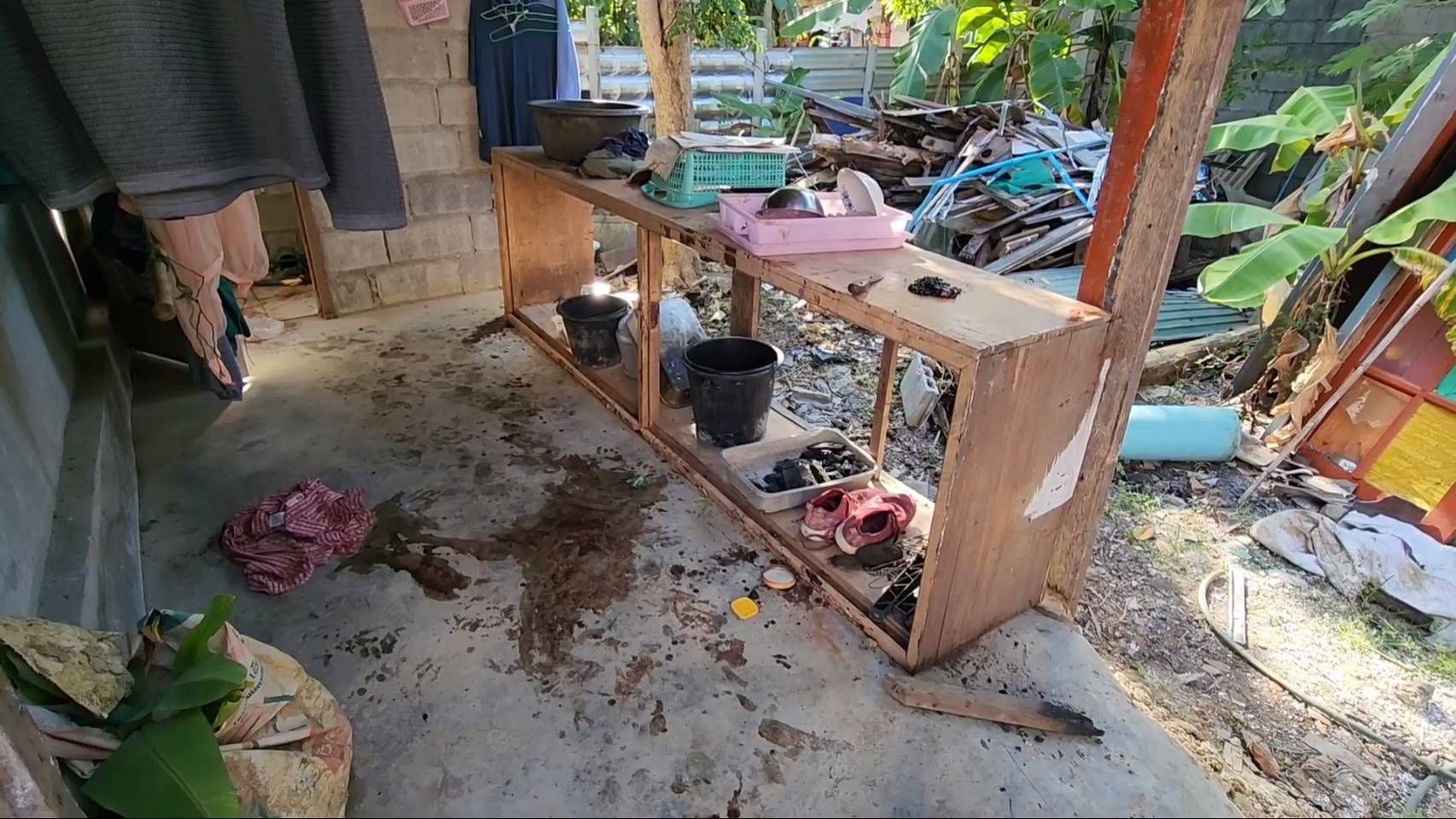 ที่เกิดเหตุเป็นบ้านปูนขนาดชั้นเดียวบริเวณรอบตัวบ้าน พบรอยเลือดจำนวนมาก ตกอยู่ บริเวณทางเดิน หน้าบ้านและข้างตัวบ้านนอกจากนี้บริเวณห้องน้ำยังพบกองเลือดอีกจำนวนหนึ่ง ซึ่งทางเจ้าหน้าที่ตำรวจได้กันพื้นที่เกิดเหตุเอาไว้ป้องกันไม่ให้บุคคลที่ไม่เกี่ยวข้องเข้าไปยุ่งเกี่ยวกับพยานหลักฐาน