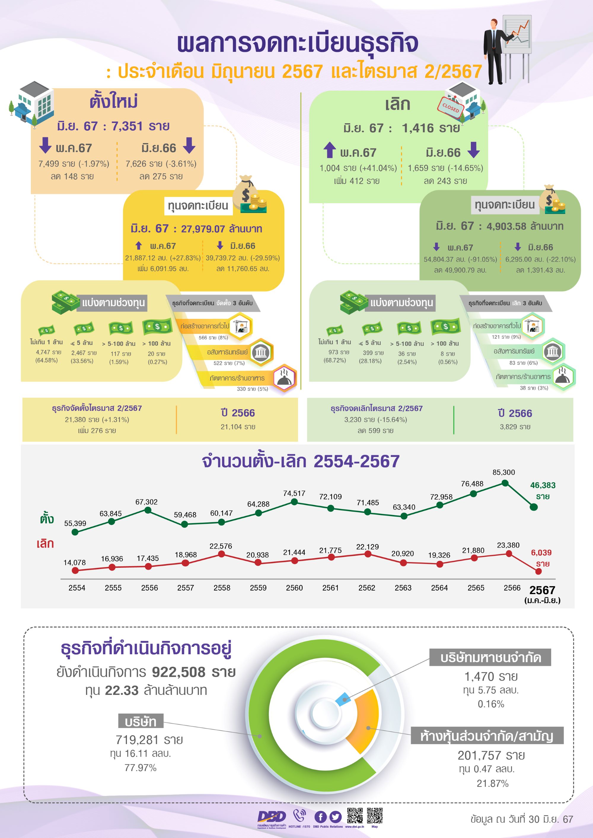การจดทะเบียนจัดตั้งธุรกิจเดือนมิถุนายน 2567 มีจำนวนทั้งสิ้น 7,351 ราย ลดลง 275 ราย คิดเป็น 3.61% เมื่อเทียบกับช่วงเวลาเดียวกันของปีก่อน (มิ.ย. 2566) และมีมูลค่าทุนจดทะเบียน 27,979.07 ล้านบาท ลดลง 11,760.65 ล้านบาท คิดเป็น 29.59% เมื่อเทียบกับช่วงเวลาเดียวกันของปีก่อน (มิ.ย. 2566) โดยเดือนมิถุนายน 2567 มีธุรกิจจัดตั้งสูงสุด 3 อันดับแรก ได้แก่ ธุรกิจก่อสร้างอาคารทั่วไป จำนวน 566 ราย ธุรกิจอสังหาริมทรัพย์ จำนวน 522 ราย และ ธุรกิจภัตตาคาร/ร้านอาหาร 330 ราย คิดเป็นสัดส่วน 7.70% 7.10% และ 4.49% จากจำนวนการจัดตั้งธุรกิจเดือนมิถุนายน 2567 ตามลำดับ