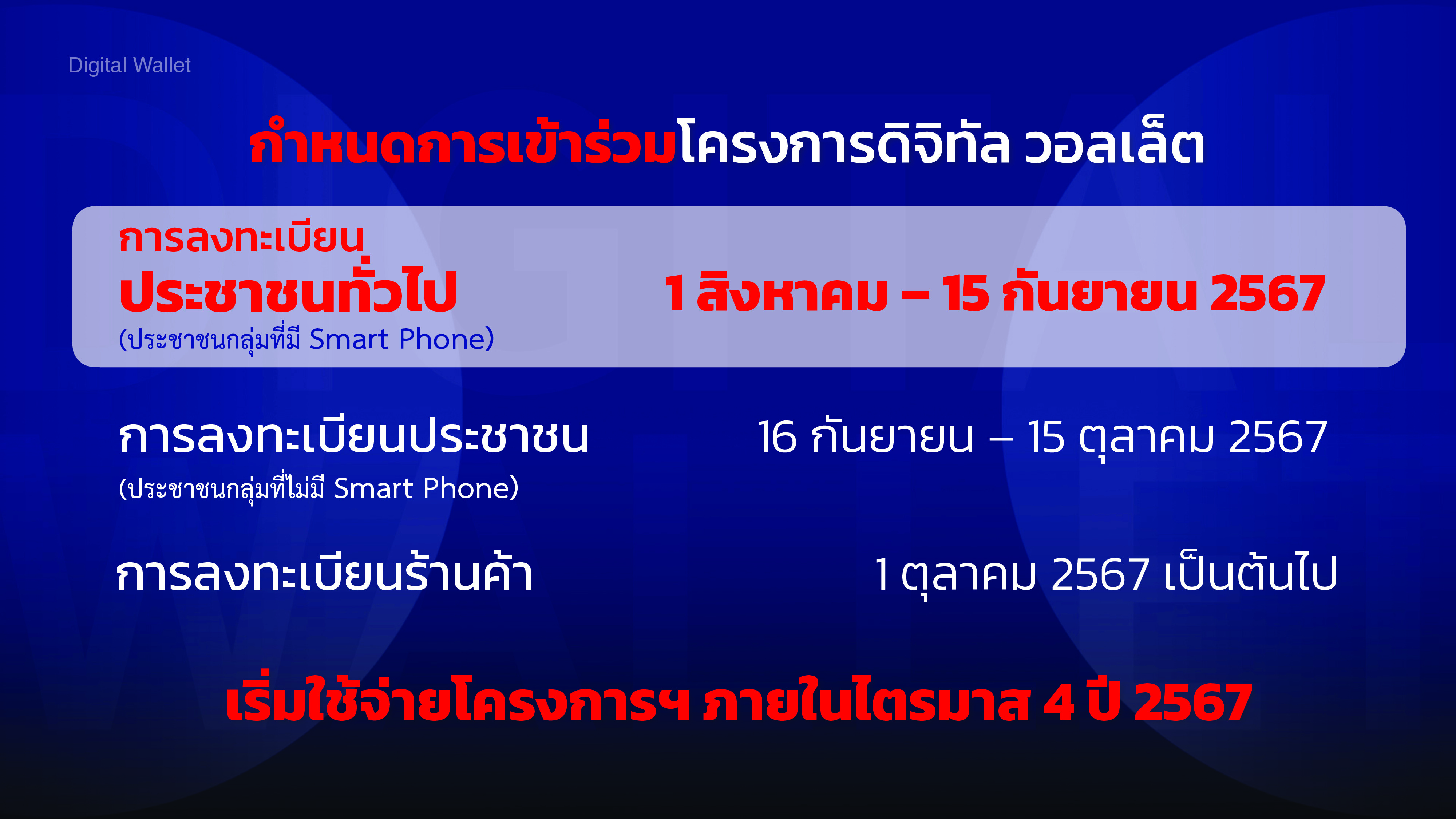รัฐบาลเดินหน้าดิจิทัลวอลเลต โครงการเพื่อประชาชน พร้อมขับเคลื่อน กระตุ้นเศรษฐกิจทั่วประเทศ เปิดให้ประชาชนลงทะเบียนตั้งแต่ 1 ส.ค.- 15 ก.ย. 2567