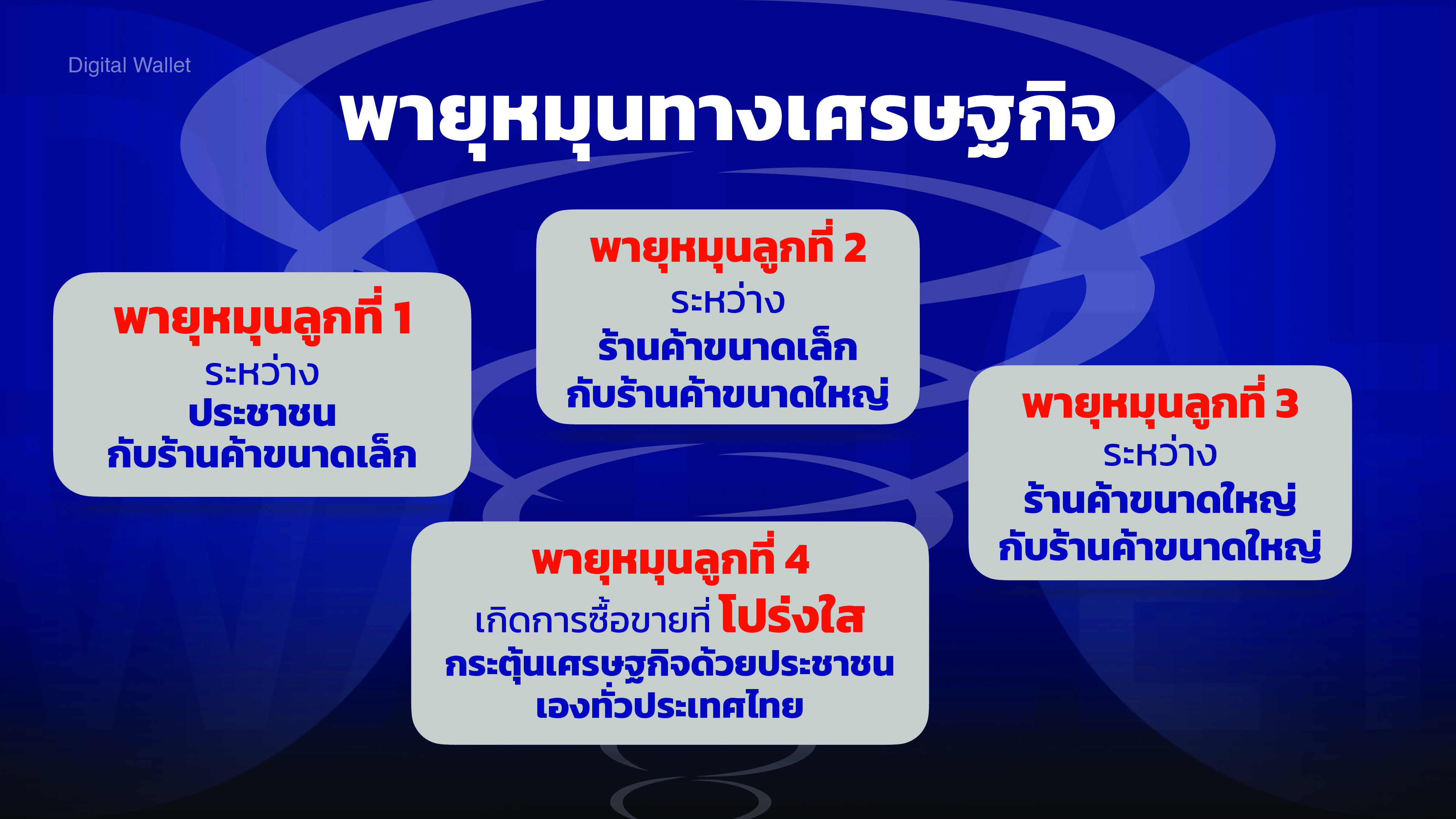 ซึ่งเมื่อเริ่มดำเนินโครงการฯ แล้ว จะก่อให้เกิดพายุหมุนทางเศรษฐกิจจานวน 4 ลูก ได้แก่ พายุหมุนลูกที่ 1 การใช้จ่ายระหว่างประชาชนกับร้านค้าขนาดเล็ก ถือเป็นกระตุ้นเศรษฐกิจไปยังฐานราก กระจายไปพร้อมกันทุกอำเภอทั่วประเทศ ช่วยบรรเทาความเดือดร้อน ลดภาระค่าใช้จ่ายแก่ประชาชน พายุหมุนลูกที่ 2 การใช้จ่ายระหว่างร้านค้าขนาดเล็กกับร้านค้าขนาดใหญ่ และพายุหมุนลูกที่ 3 การใช้จ่ายระหว่างร้านค้าขนาดใหญ่กับร้านค้าขนาดใหญ่ซึ่งจะทำให้เกิดการต่อยอดกำลังซื้อ การบริโภค หรือสร้างโอกาสในการลงทุนเพื่อประกอบอาชีพ และพายุหมุนลูกที่ 4 พลังการใช้จ่ายของประชาชนแต่ละคนจะเกิดผลต่อการหมุนเวียนของกิจกรรมทางเศรษฐกิจเป็นทวีคูณ ช่วยฟื้นฟูภาคการผลิตของประเทศ และสร้างความเชื่อมั่นต่อระบบเศรษฐกิจในภาพรวม ทั้งนี้ รัฐบาลจะเปิดให้ประชาชนที่สนใจลงทะเบียนเข้าร่วมโครงการฯ ในระหว่างวันที่ 1 สิงหาคม ถึง 15 กันยายน 2567 และมีกำหนดการที่จะให้เริ่มใช้จ่ายในโครงการฯ ภายในไตรมาสที่ 4 ของปี 2567